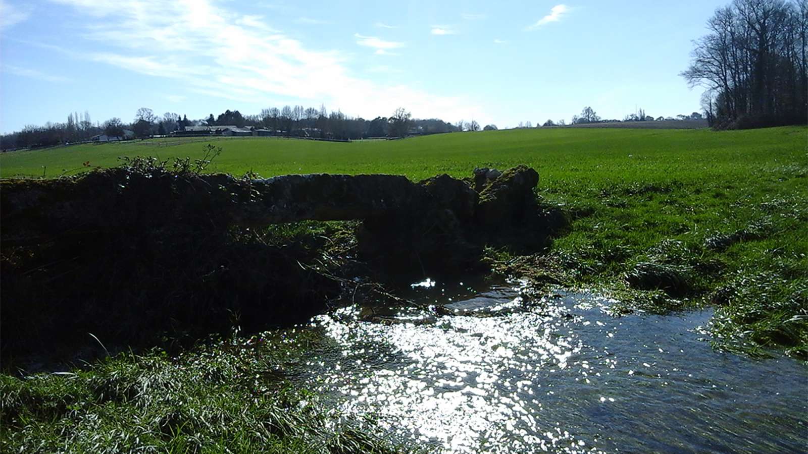 Pour quelques mètres de plus, en passant la rivière "La Cendronne" (1ère catégorie) en contrebas du lieu-dit "Chalons", vous pouvez longer le cours d'eau sur une centaine de mètres et découvrir le pont de Guingan. À la limite des communes d’Ozillac et de St-Simon-de-Bordes. La Cendronne est aujourd’hui généralement dépourvue d’eau. Ce pont est formé d’une suite de blocs de pierre délimitant un passage étroit mais suffisant pour un homme ou pour un animal, un âne ou un mulet portant un sac, par exemple. Il est difficile de dater ce pont. Certainement d’origine médiévale, il peut aussi avoir été rétabli au début du XIXe siècle.