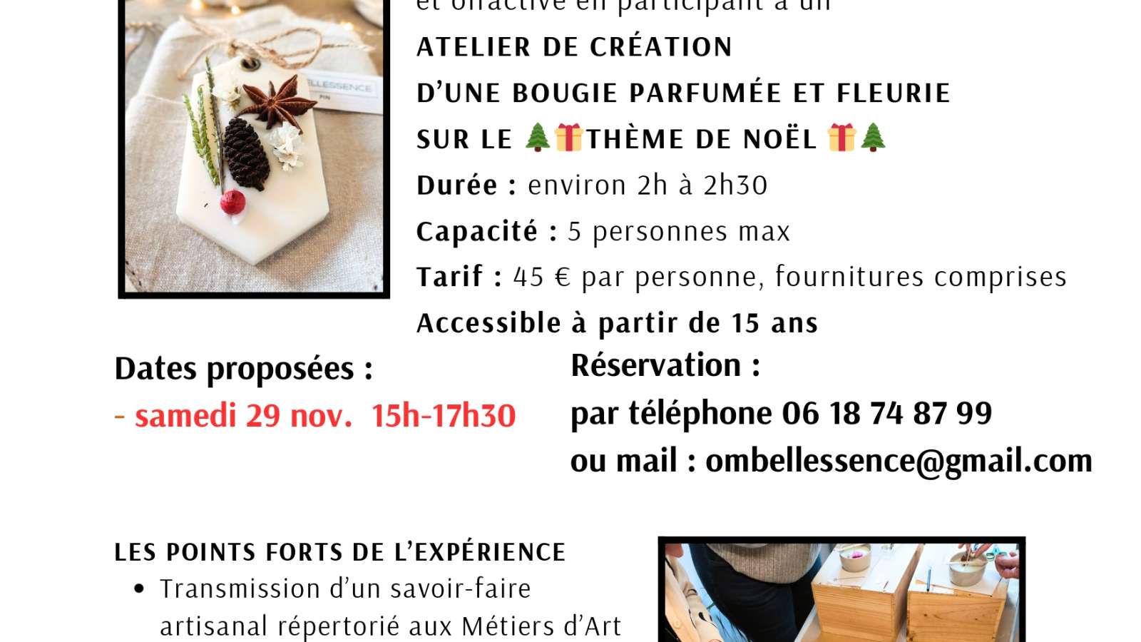 Tout au long de cet atelier d'environ 2 heures à 2 heures 30, Carine vous partage sa passion, les gestes de ce métier mêlant tradition et modernité, afin de créer vous-même une bougie que vous personnaliserez selon vos goûts et votre inspiration sur le thème de Noël.