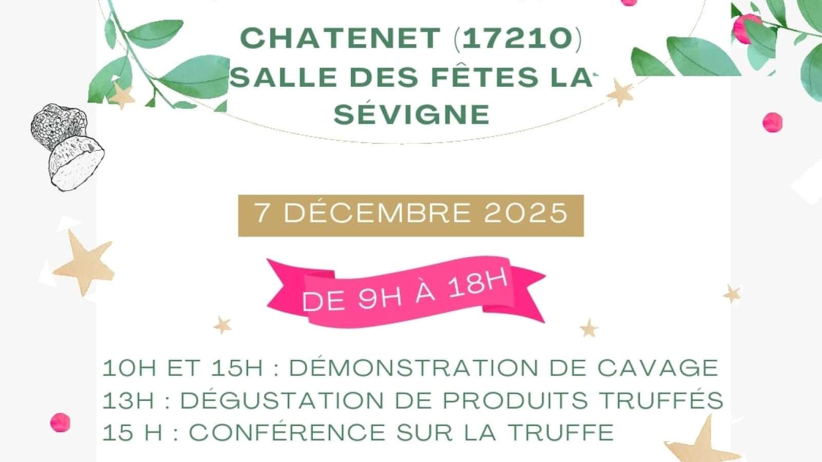 Nous vous proposons de découvrir le monde passionnant de la Truffe Noire en Haute Saintonge à travers notre fête annuelle de la Truffe. Cet événement sera ponctué par différentes animations : démonstration de cavage (recherche de truffes par un chien spécialisé), dégustation de produits truffés à 13h (planche avec brouillade truffée - brie truffé - brillat savarin truffé et beurre truffé; sur réservation avant le 1 dec au 06.42.58.63.69), conférence autour de la culture de la truffe. Vous pourrez également achetez des truffes, produits truffés, ou bien effectué vos réservations pour Noël ! Des producteurs locaux de produits du terroir (miel, asperges, canard, pineau-cognac etc.) seront également présents pour vous présenter leurs produits ! Venez nombreux !