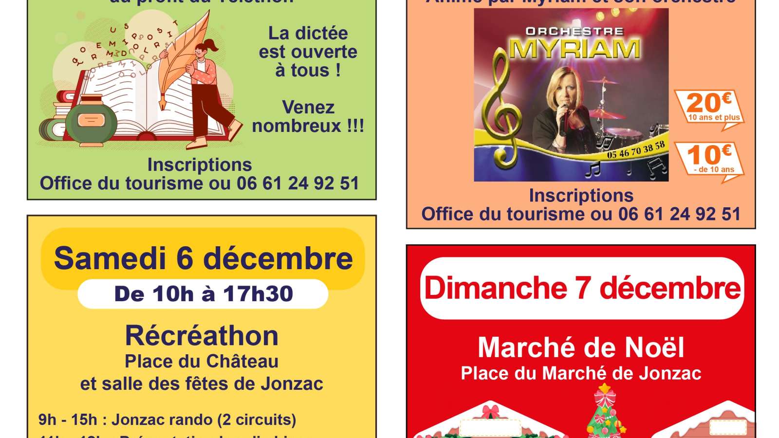 | Permanences de réservation pour le dîner dansant du Téléthon auront lieux à l'office de tourisme les mardis 18 et 25 novembre et les vendredis 21 et 28 novembre de 10h à 12h et de 14h à 17h ou par téléphone au 06 61 24 92 51 |