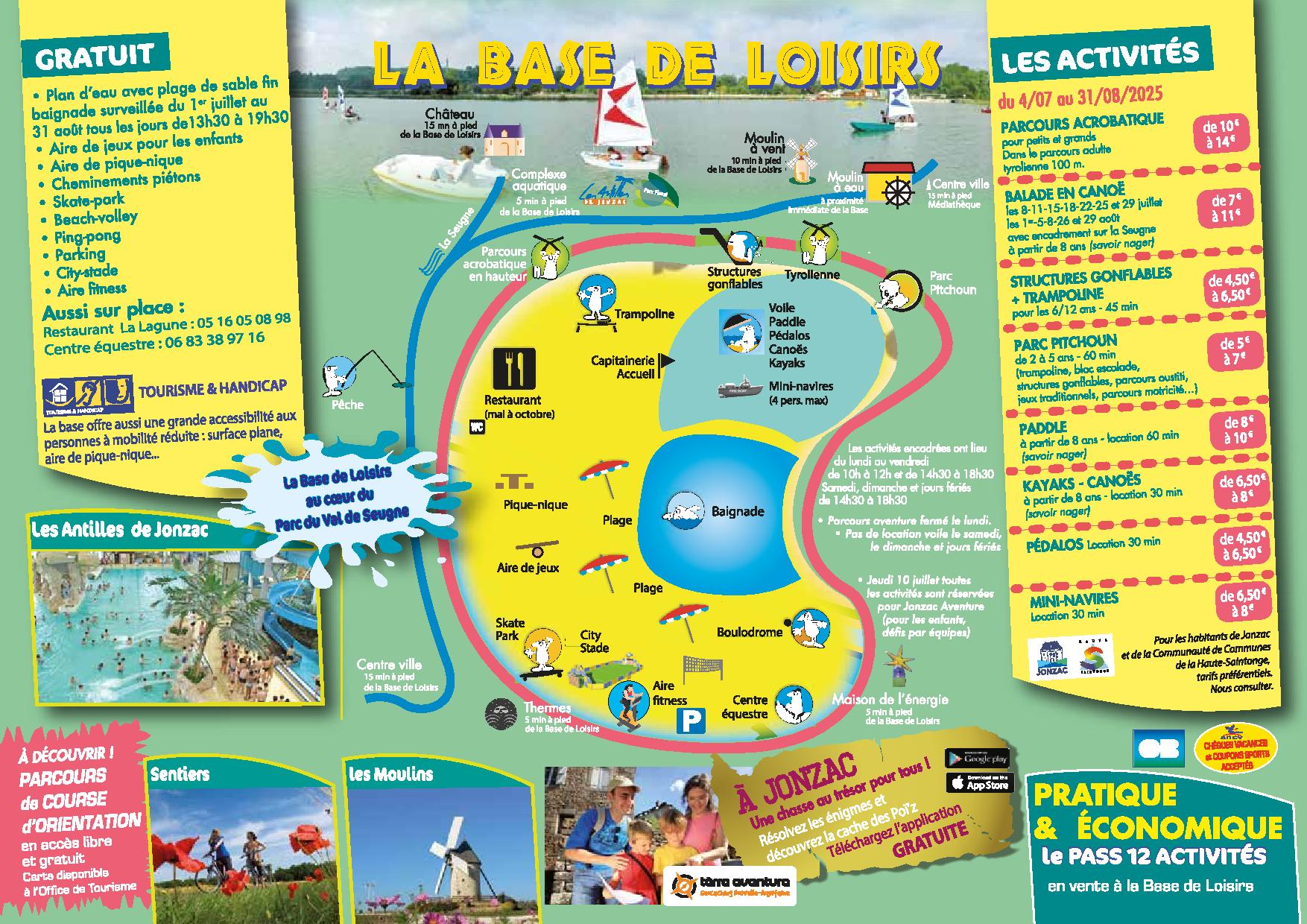 Retrouvez ici les informations sur la baignade, les activités estivales et le restaurant de la base de loisirs de Jonzac. Une carte de localisation des activités est en bas de cet article.