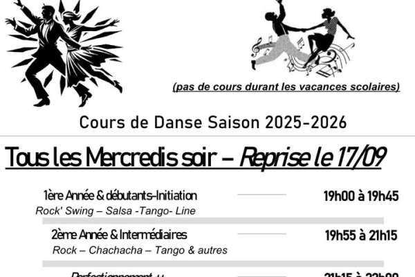 Danse de Salon (Rock&Swing, Cha-Cha-Cha, Line-Danse, Salsa, Tango, Valse & Quick) Tous les Mercredis soir. 1ère année & débutants - Initiation : 19h00 à 19h45 2ème année & intermédiaires : 19h55 à 21h15 Perfectionnement ++ : 21h15 à 22h00