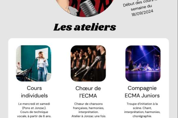 Troupe dynamique composée d'une vingtaine de chanteurs aux styles aussi variés que complémentaires. Cours individuels, choeur de l'Ecma, compagnie ECMA juniors à chacun son expression artistique au travers du chant