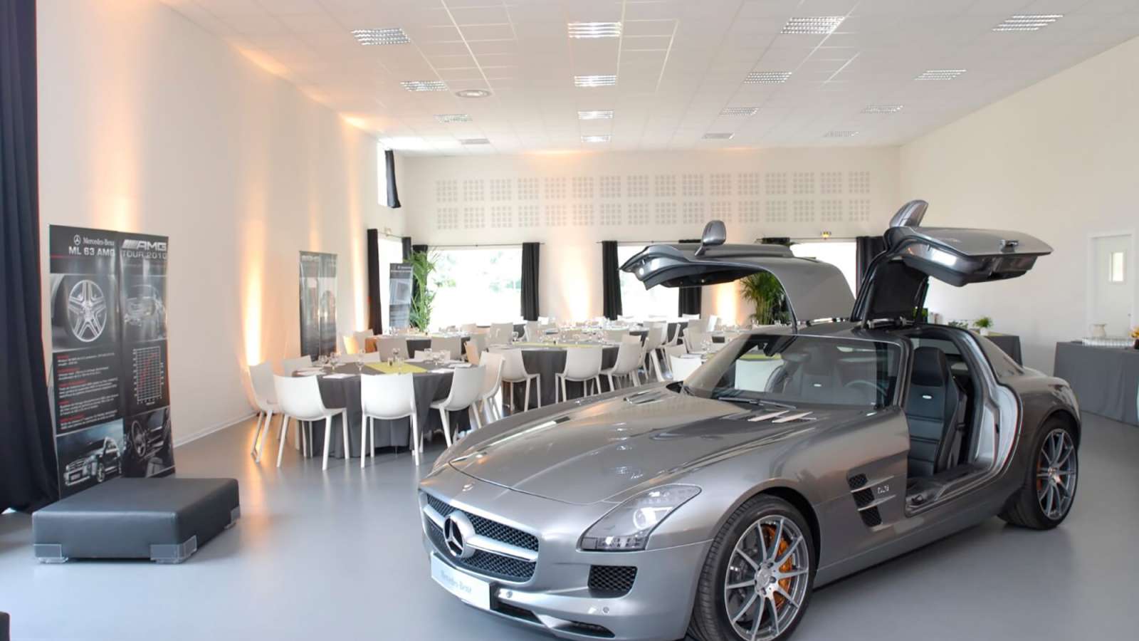 Une salle de 70m² accolée à un office traiteur est idéale pour l’accueil, les cocktails et la restauration.