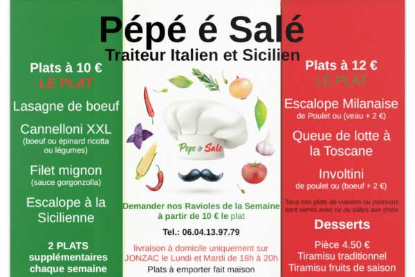 Traiteur italien et sicilien présent sur le marché et propose de la livraison à domicile sur Jonzac les lundi et mardi entre 18h et 20h Plats à emporter faits maison