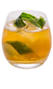 Les écraser avec un pilon pour exprimer les arômes d’épices. Ajouter les glaçons et verser le cognac. Exprimer un zest de citron vert, compléter de limonade et décorer d’une épluchure de concombre.