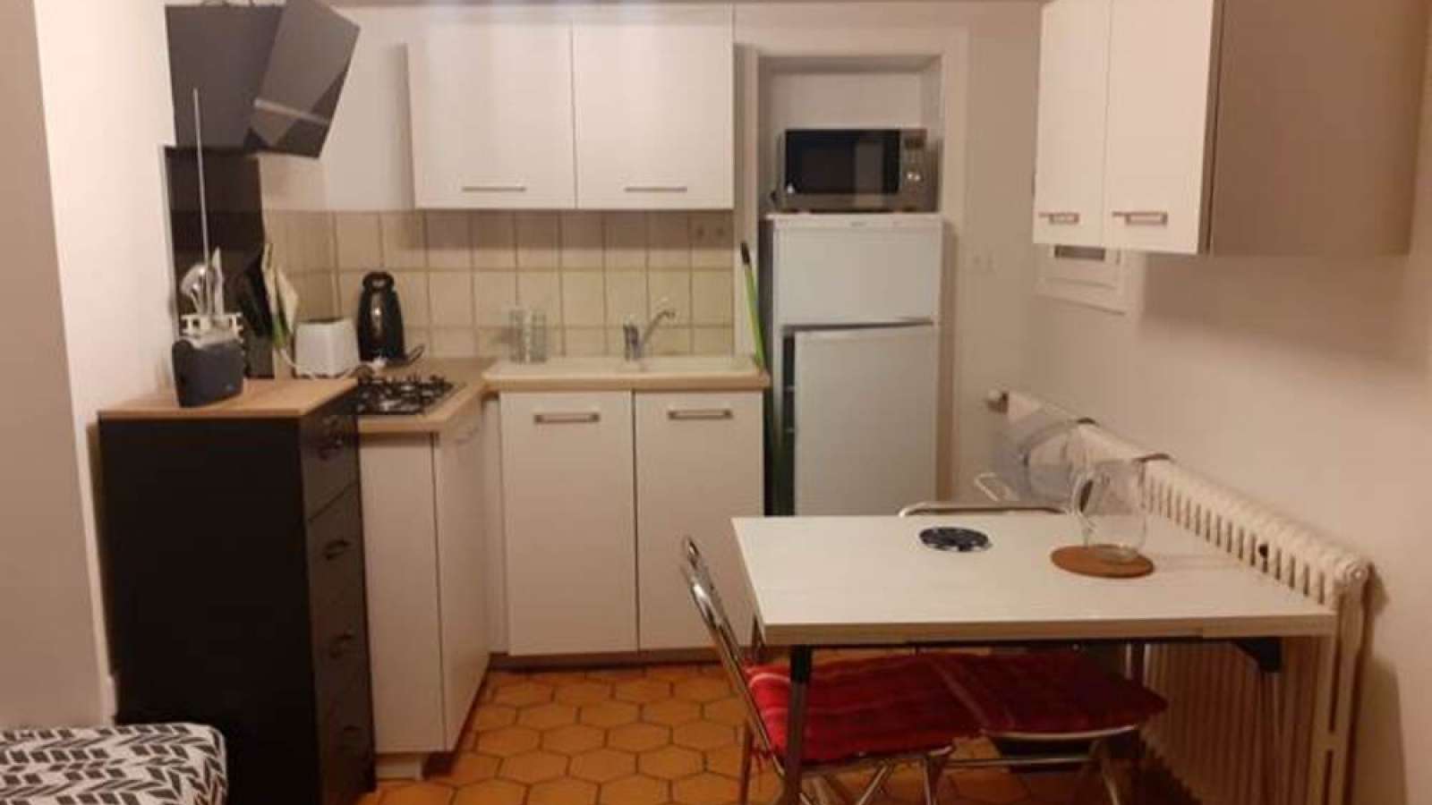 Appartement comprenant une cuisine équipée avec entre autres un four, une hotte, un micro-ondes, un grille-pain, une bouilloire, une télévision dans le salon.