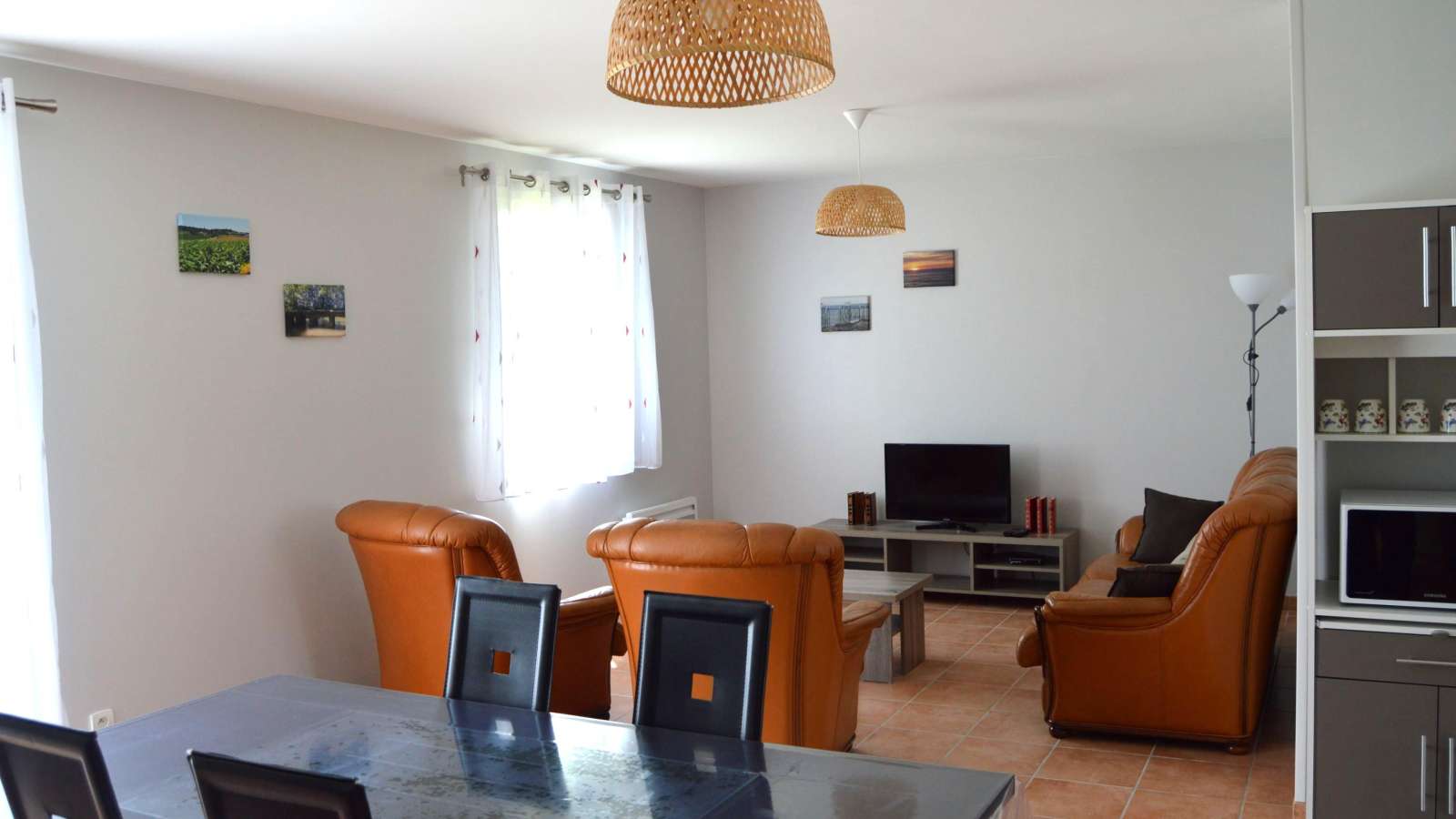 Le salon comporte un canapé 3 places, 2 fauteuils, une table basse, une TV et connexion internet.