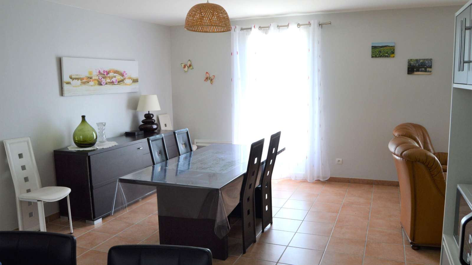 La salle à manger comprend une table avec 6 chaises et un buffet bas.
