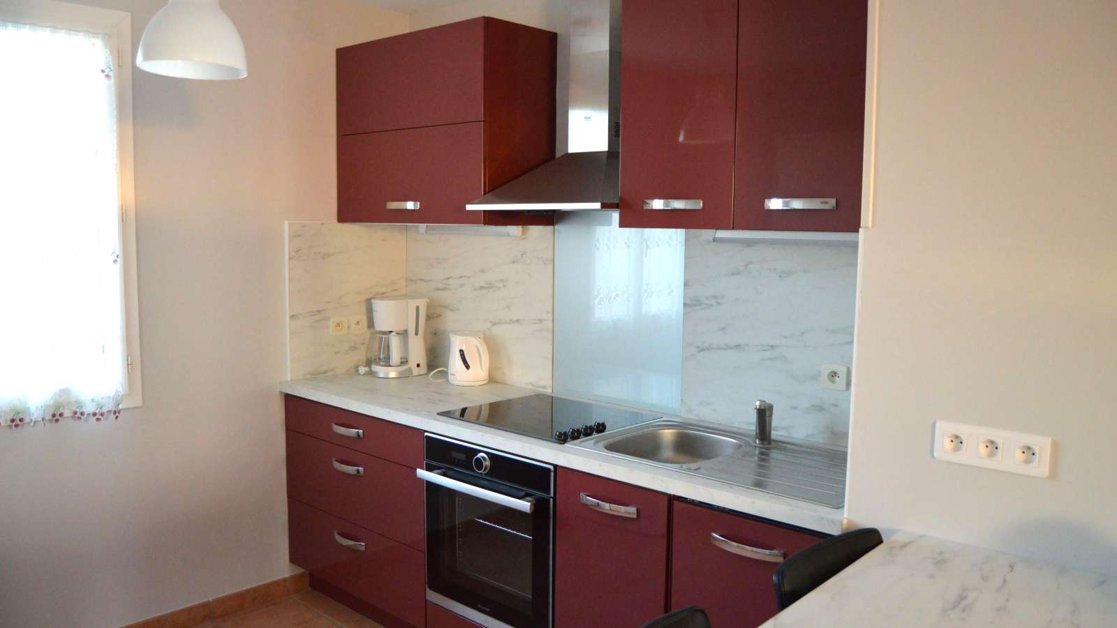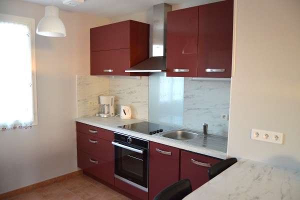 La cuisine ouverte sur la salle à manger et le salon, est équipée d'une table haute et 4 chaises hautes, d'une plaque vitrocéramique 4 feux, une hotte, un four, un micro-ondes, un lave-vaisselle, un réfrigérateur avec congélateur, aussi : cafetière, bouilloire, grille-pain et vaisselle.