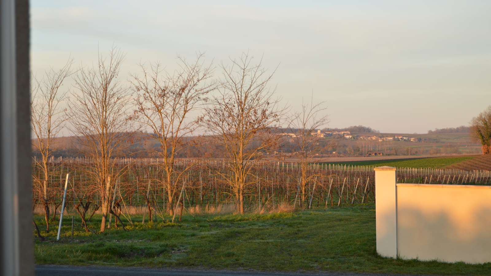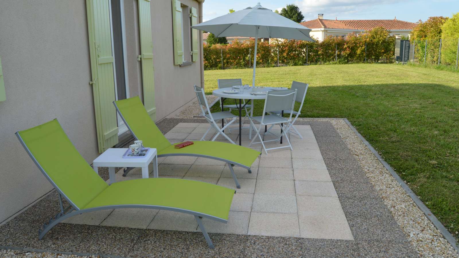 La terrasse, avec salon de jardin, bains de soleil, parasol et barbecue, est exposée à l'est.
