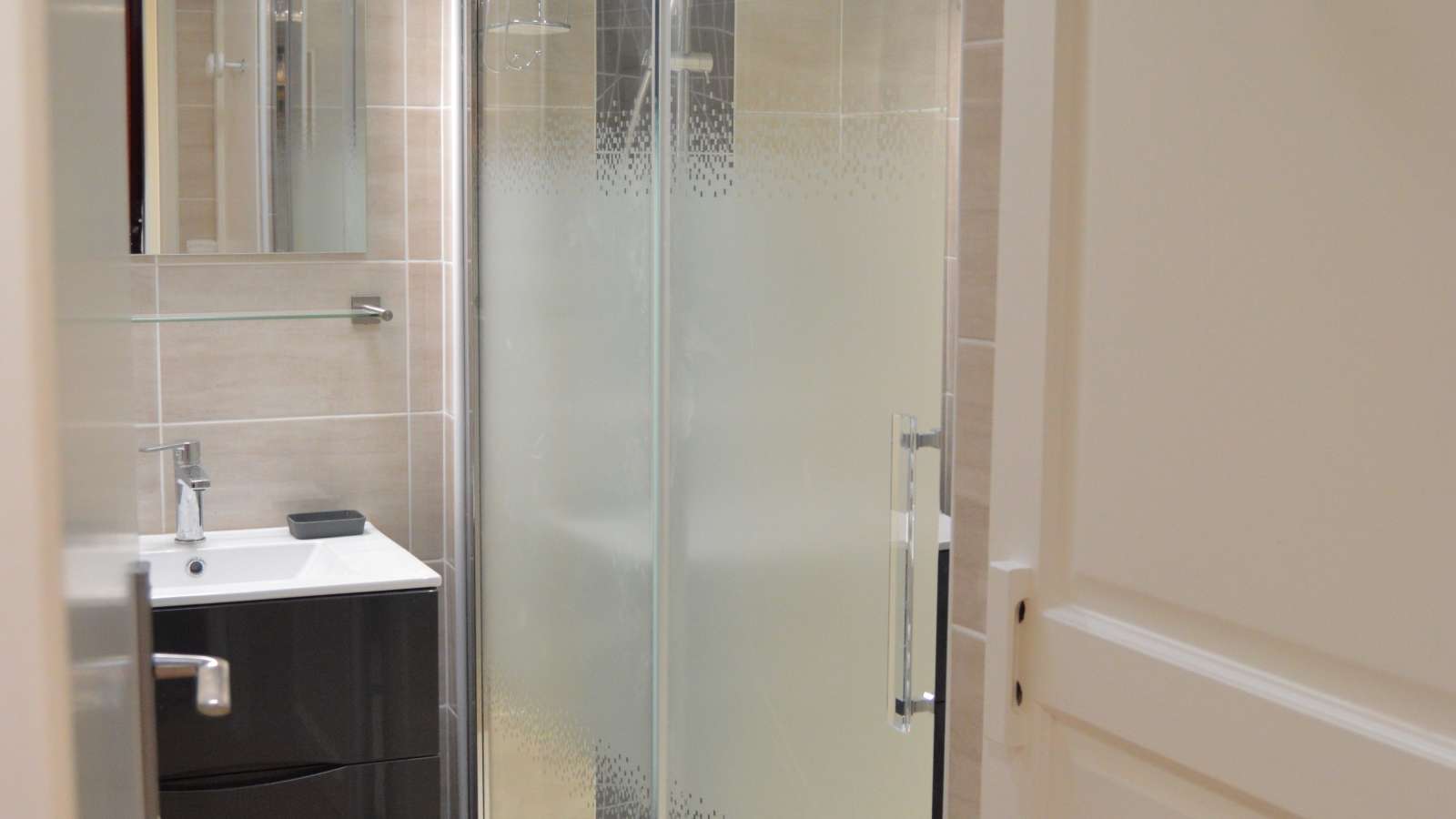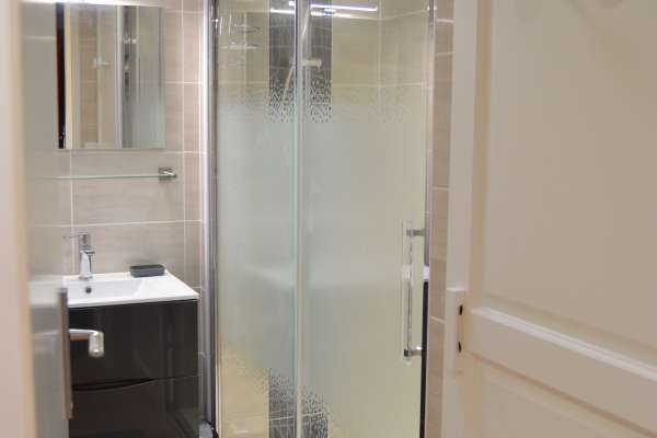 La salle d'eau est dotée d'une grande douche à l'italienne (70x160), un lavabo, un sèche-serviette et un lave-linge.
