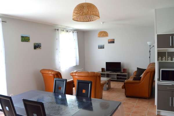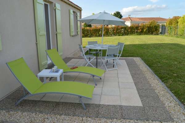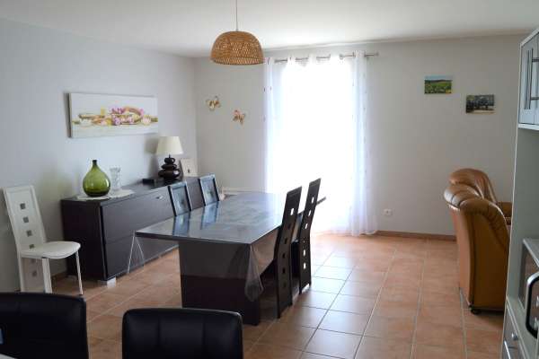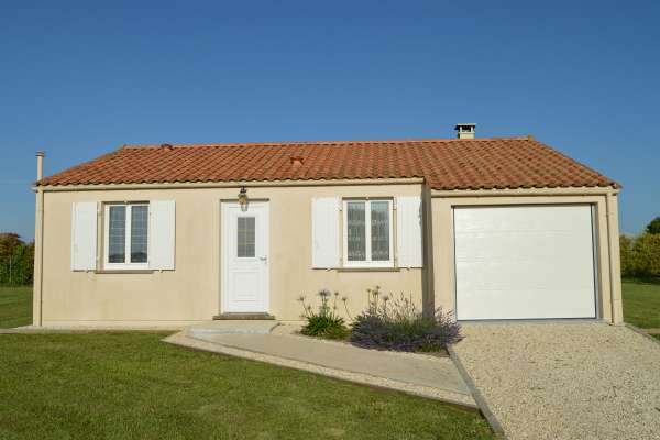 Maison récente, individuelle pour 4 personnes à la campagne située à 10mn de Jonzac. A 10mn des thermes et des Antilles de Jonzac, et à 50 mn de l'Océan (Royan), c'est une maison de plain pied de 70 m² avec garage sur un terrain de 1400m². La cuisine ouverte sur la salle à manger et le salon, est équipée d'une table haute et 4 chaises hautes, d'une plaque vitrocéramique 4 feux, une hotte, un four, un micro-ondes, un lave-vaisselle, un réfrigérateur avec congélateur, aussi : cafetière, bouilloire, grille-pain et vaisselle. La salle à manger comprend une table avec 6 chaises et un buffet bas. Le salon comporte un canapé 3 places, 2 fauteuils, une table basse, une TV et connexion internet. Un lit de 140x190, 2 tables de chevet, rangement et penderie meublent chacune des 2 chambres. La salle d'eau est dotée d'une grande douche à l'italienne (70x160), un lavabo, un sèche-serviette et un lave-linge. Le WC est indépendant. L'entrée donne sur la pièce principale avec un vestiaire et range-chaussures. La terrasse, avec salon de jardin, bains de soleil, parasol et barbecue, est exposée à l'est. Le chauffage est électrique. Un aspirateur, une table à repasser avec fer complètent les équipements.