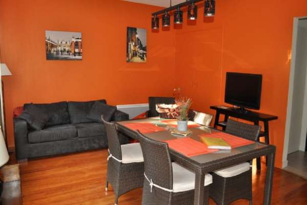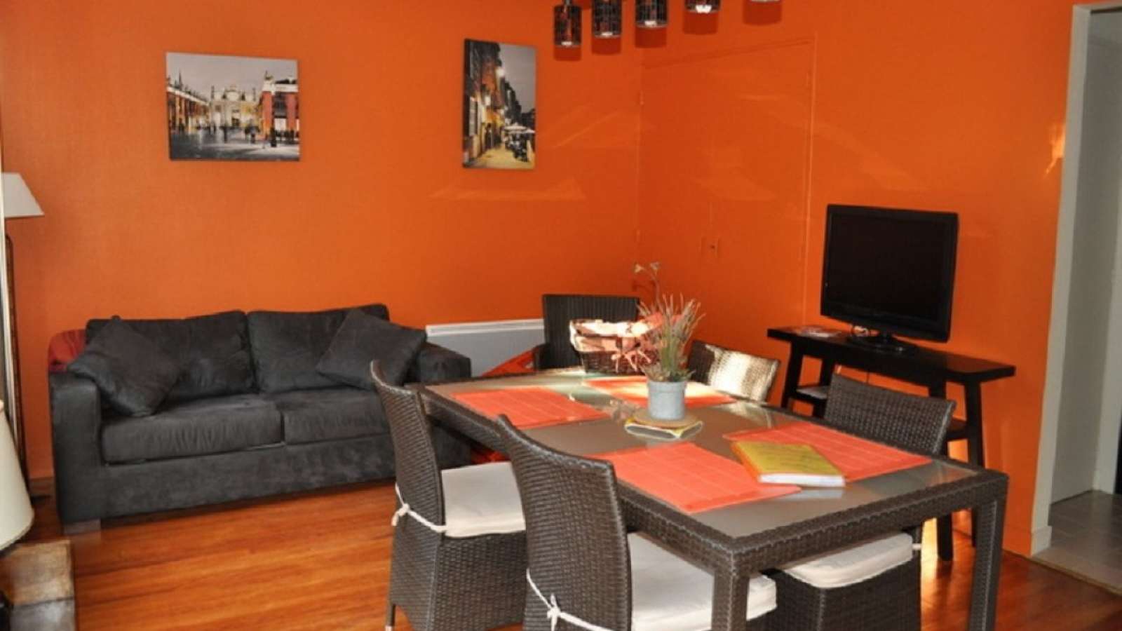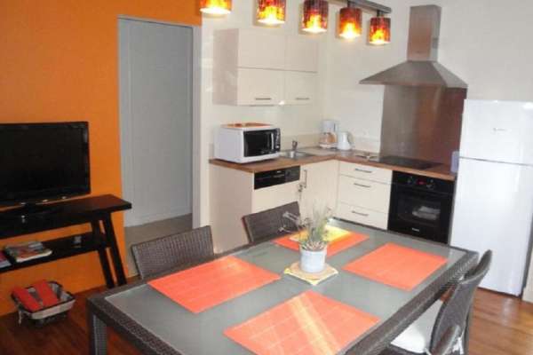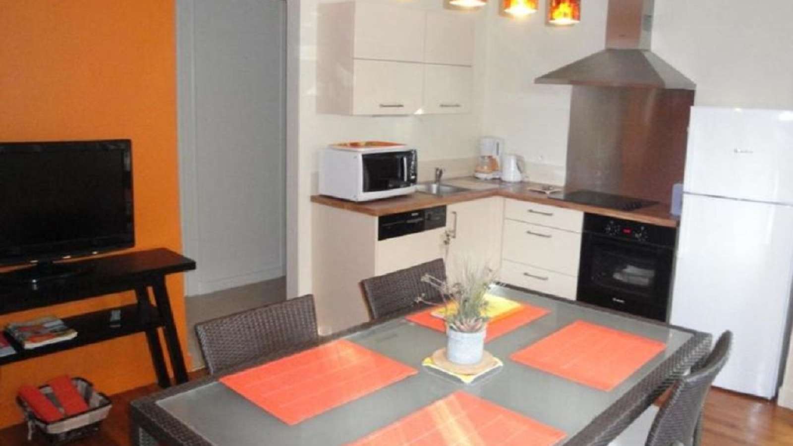 Appartement comprenant une cuisine équipée avec un micro-ondes, un four, une plaque vitro-céram, une hotte, un lave-vaisselle, un réfrigérateur-congélateur, un salon avec téléviseur, canapé convertible, deux chambres, l'une avec un lit de 140, l'autre avec deux lits de 90, salle d'eau avec douche, meuble-vasque, lave-linge.