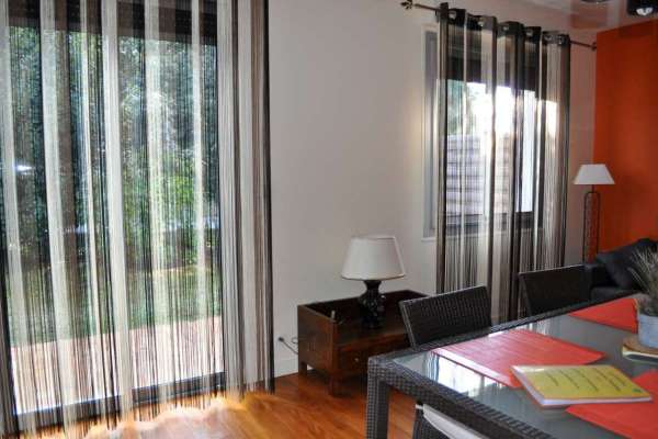 Appartement dans maison de plain-pied entourée d'un jardin arboré de 30 ares, situé au rez-de-chaussée, à 250m des Thermes, à 500m du centre-ville et à 1,5km du centre aqualudique des "Antilles de Jonzac". Appartement comprenant une cuisine équipée avec un micro-ondes, un four, une plaque vitro-céram, une hotte, un lave-vaisselle, un réfrigérateur-congélateur, un salon avec téléviseur, canapé convertible, deux chambres, l'une avec un lit de 140, l'autre avec deux lits de 90, salle d'eau avec douche, meuble-vasque, lave-linge. Le logement est équipé d'un accès internet et de la climatisation. À l'extérieur, terrasse privative avec transats et barbecue.