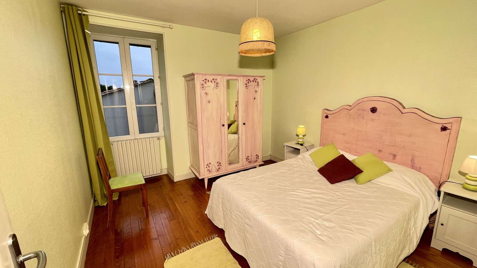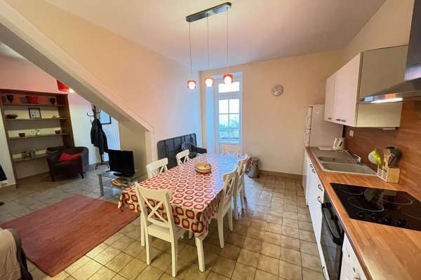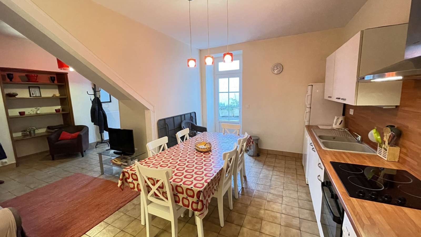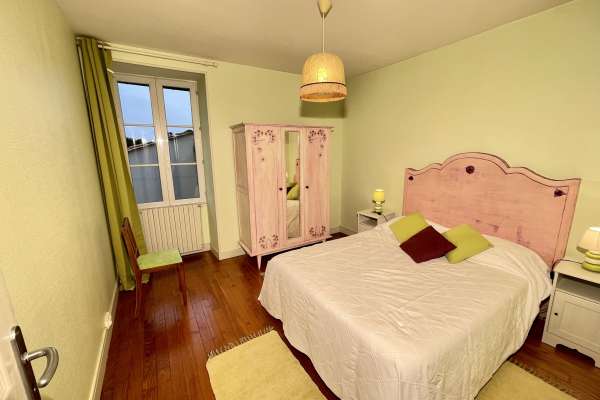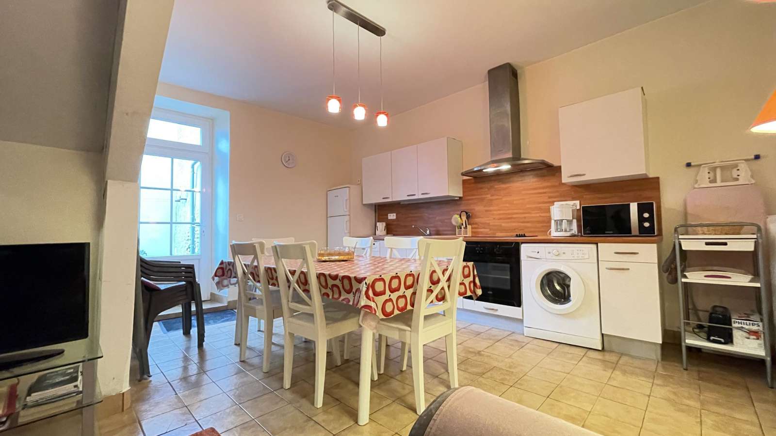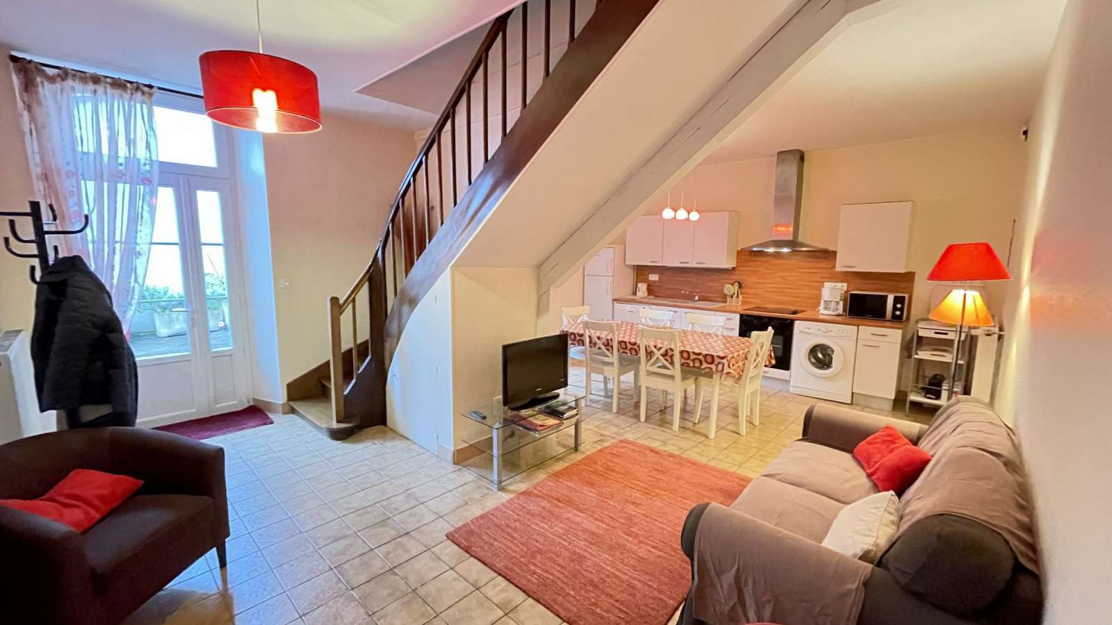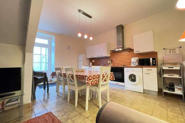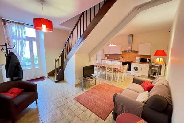 Appartement au rez-de-chaussée et à l'étage situé en centre-ville. Au cœur des commodités et des commerces de Jonzac, grand appartement de 55m2 avec cour intérieure. Situé à 1,5km du centre aqualudique des "Antilles de Jonzac" et des Thermes, comprenant au rez-de-chaussée un coin cuisine équipé avec entre autres un lave-vaisselle, un four, une hotte, un micro-ondes, un lave-linge, un coin repas avec télévision, à l'étage deux chambres l'une avec un lit de 140, l'autre un BZ pour deux personnes et cour fermée.