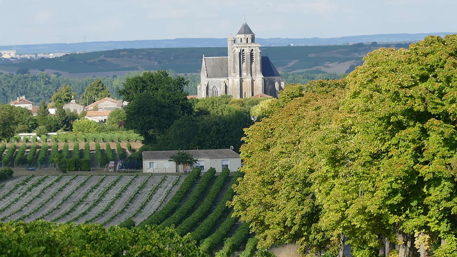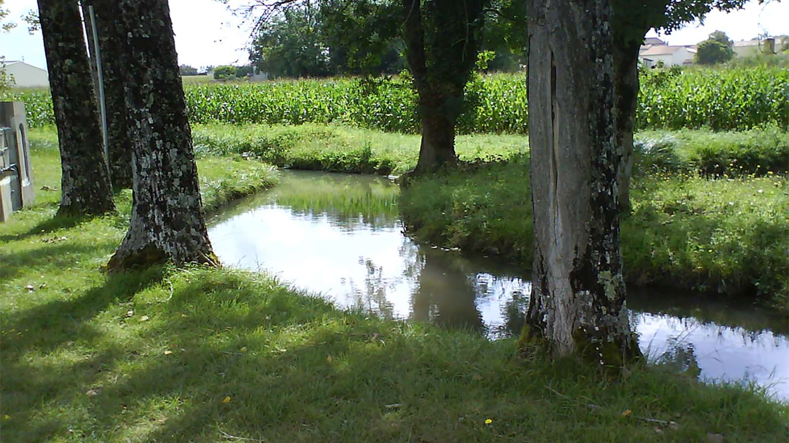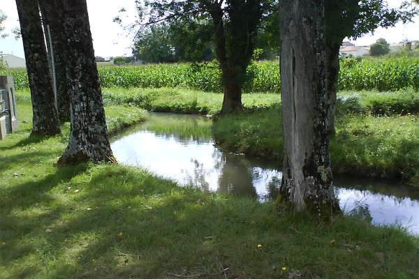 Emprunter un chemin à gauche derrière le bâtiment de ferme qui se rapproche du Né en passant en limite de marais. De beaux arbres jalonnent le chemin. Monter à droite entre vignes et cultures vers Gribeau.