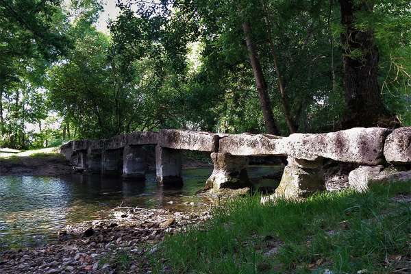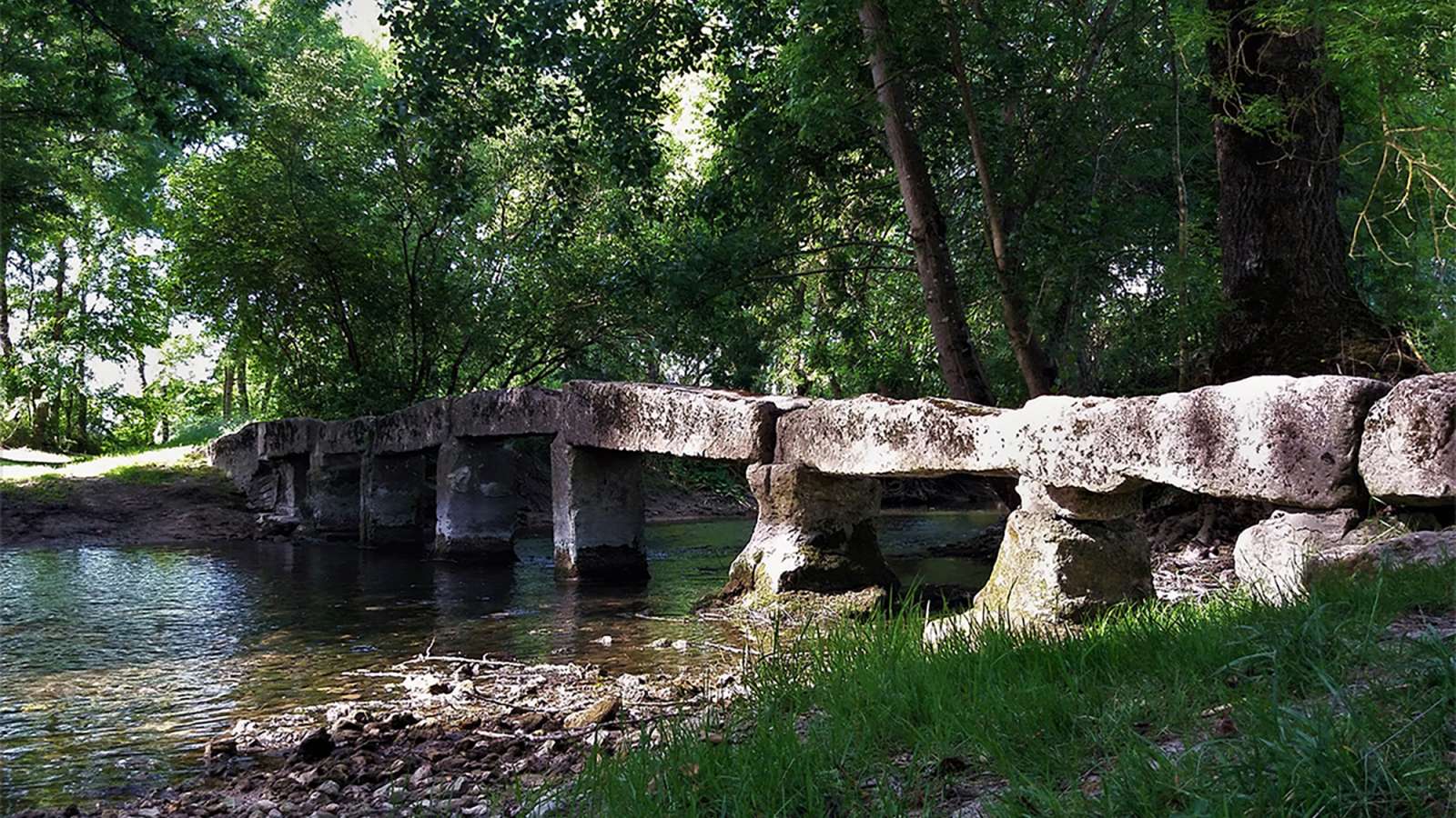En contrebas de Romas, sur les bords du Trèfle, découvrez la passerelle de Romas, appelée pont romain est en réalité un petit pont médiéval qui était destiné au passage du bétail et des piétons.