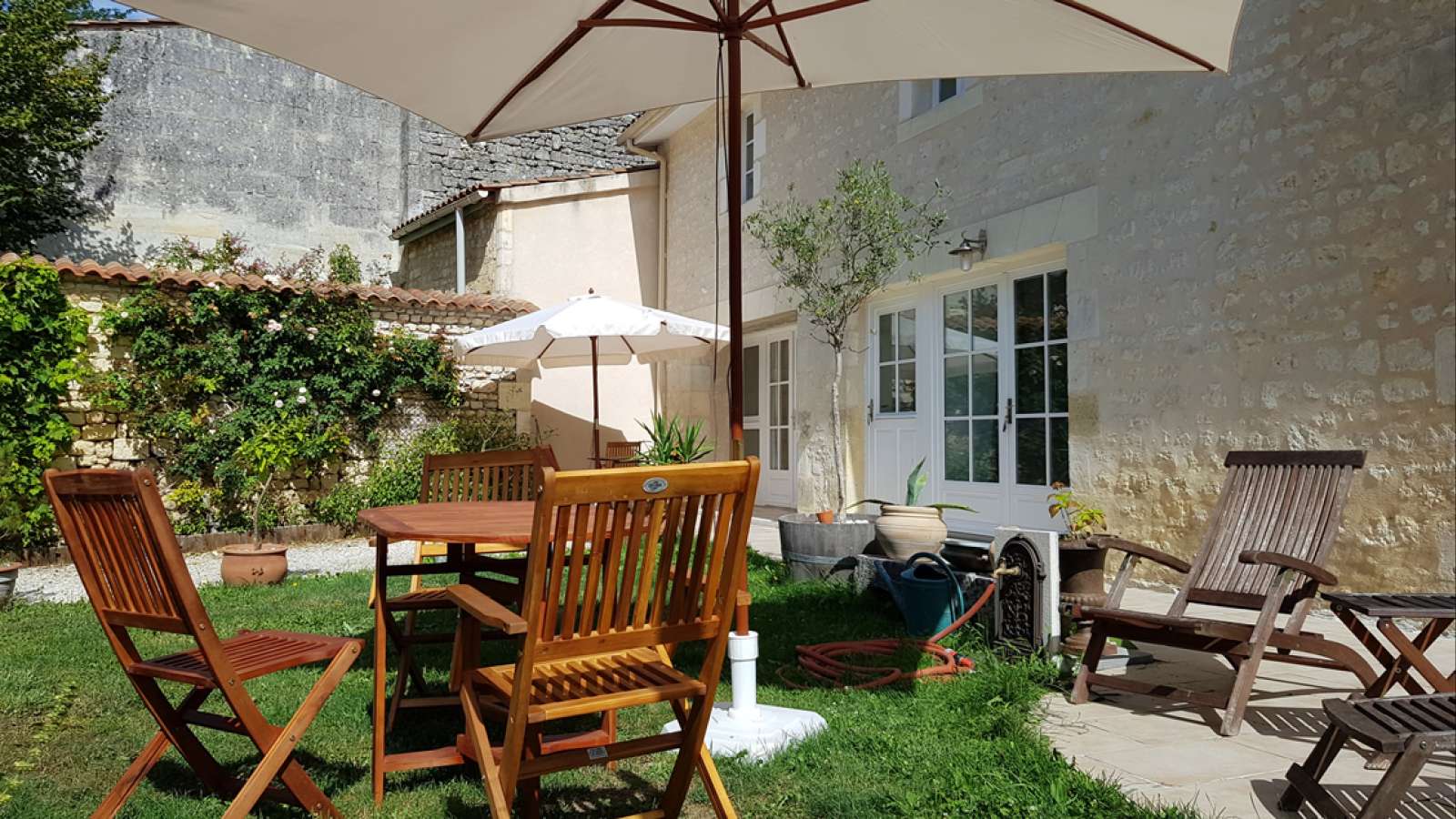 À l'extérieur, un jardin avec terrasse et mobilier.