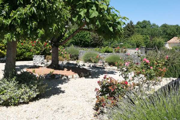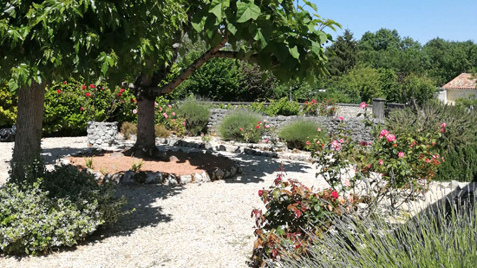 À l'extérieur, jardin fleuri fermé avec abri de jardin, mobilier, transats et barbecue.