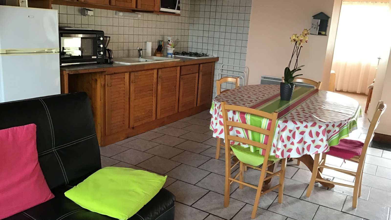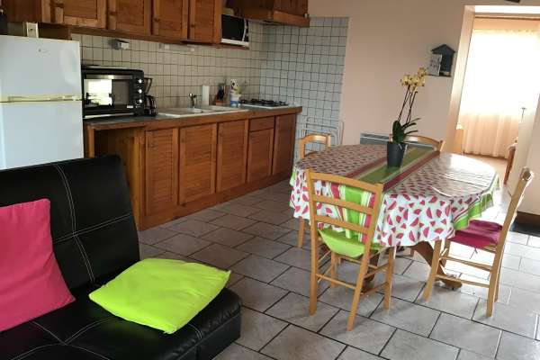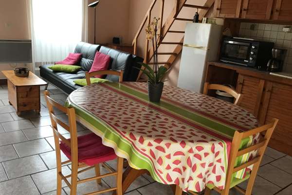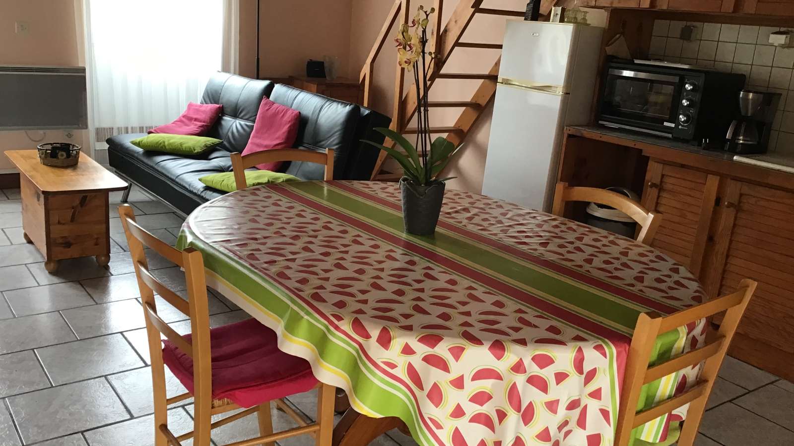 Maison comprenant un coin cuisine équipé avec entre autre un micro-ondes, un four, une hotte, un salon avec télévision, table, chaises, un canapé, une chambre avec un lit de 140, sur la mezzanine un lit 140.