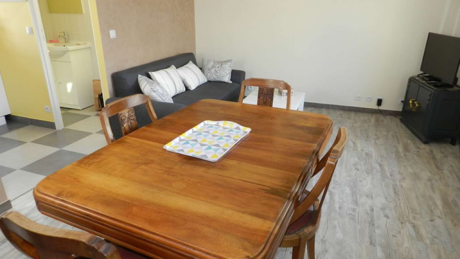 Appartement au 1er étage avec une grande chambre (environ 15m²) situé dans le cœur de ville, à quelques pas des Halles couvertes et de ses marchés hebdomadaires. Un canapé tissu deux places vous laissera profiter confortablement de la télévision 80cm avec les chaînes TNT. Une salle d'eau avec un sèche serviette et une douche à l'italienne pour plus de sécurité. Une cuisine bien équipée avec un four, une cocotte-minute, une plaque induction, un micro-onde, etc... vous aidera à préparer d'excellents petits plats à déguster dans le séjour. Lave linge et sèche linge dans laverie communs avec un autre logement. Aide à l'installation.