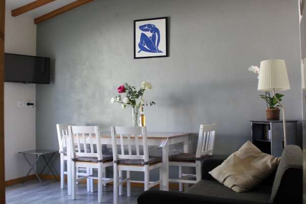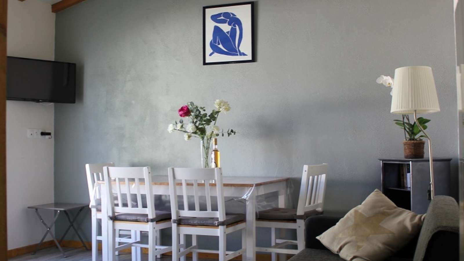 Comprenant une cuisine équipée avec entre autres un micro-ondes, un salon, un canapé, une télévision avec un lecteur DVD, une chambre avec un lit de 140.