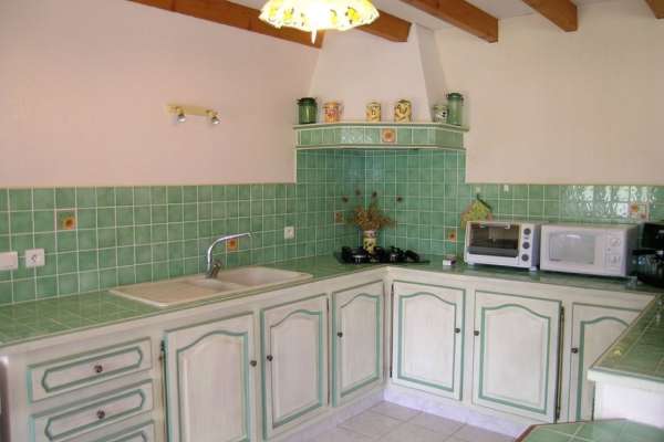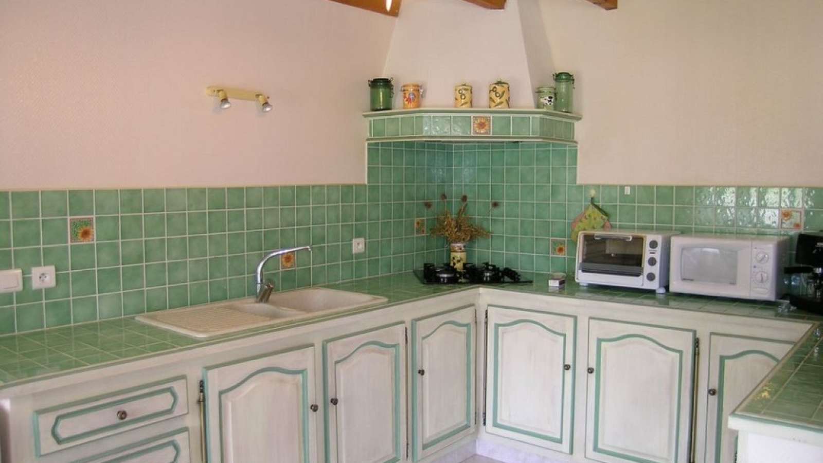 Maison comprenant un coin cuisine équipé avec entre autres un four, un micro-ondes, une hotte, un lave-vaisselle,