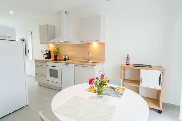 À 200m des Thermes, résidence de 20 appartements climatisés de plain-pied (création 2017, agrandissement 2021) Comprenant un parking privé, espace vert, terrasse privée, deux lits 90 joignables, aspiration centralisée, lecteur dvd sur commande. Important : les tarifs s'entendent linge lit de maison et ménage fin de séjour inclus, jetons lave-linge inclus. Sèche linge en supplément. Linge de lit et de maison changé chaque semaine. Boulodrome et barbecue. Le parking est sécurisé, parking vélo sur chaque terrasse. Deux bornes de recharge véhicules électriques.