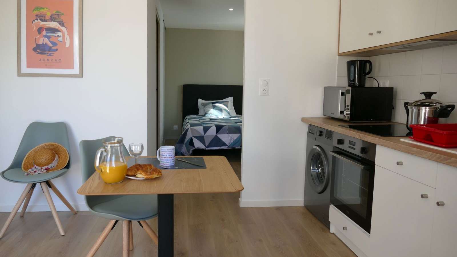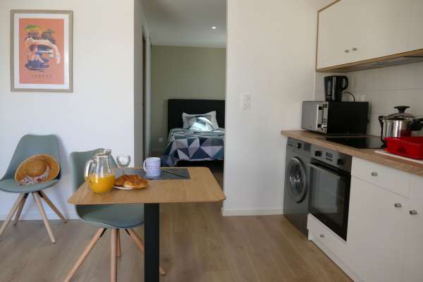 Le coin repas avec une cuisine équipée "comme une grande" (cafetière, bouilloire, plaque vitrocéramique, four traditionnel et micro-onde…).