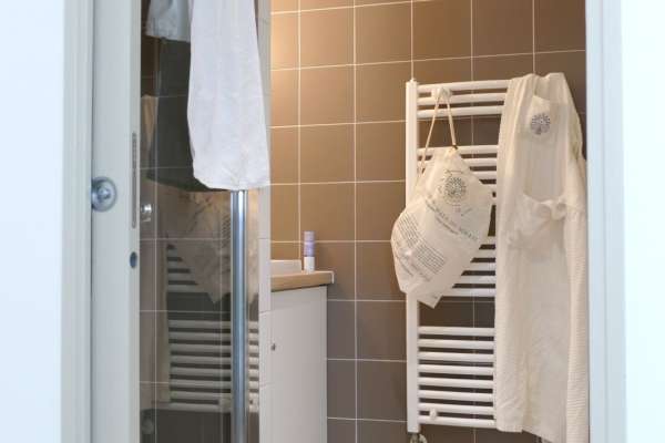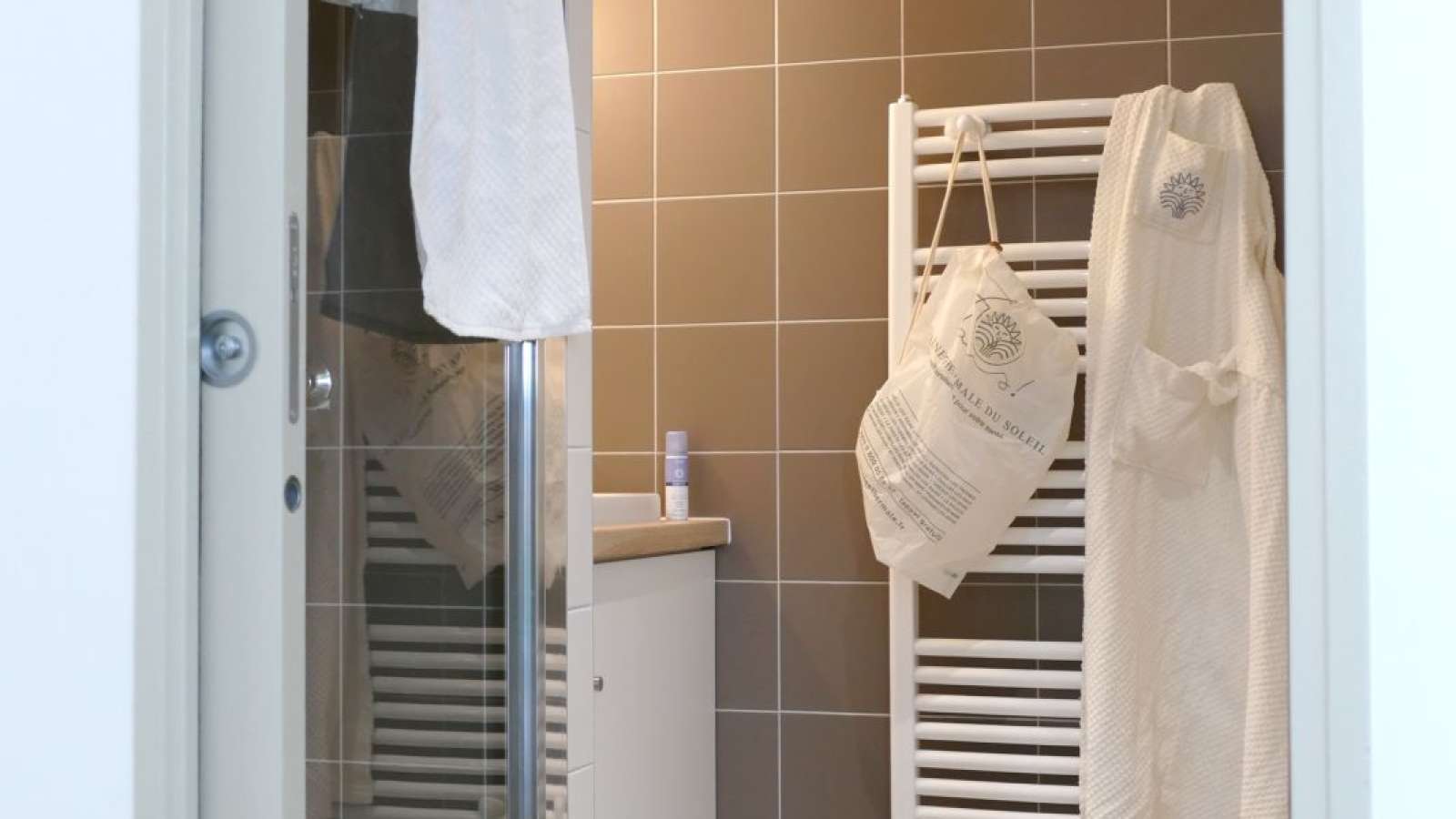 Enfin, la salle d'eau, ouvrant par une porte à galandage, se compose d'un lavabo simple vasque, d'une douche dont le bac est extra-plat, et des WC.