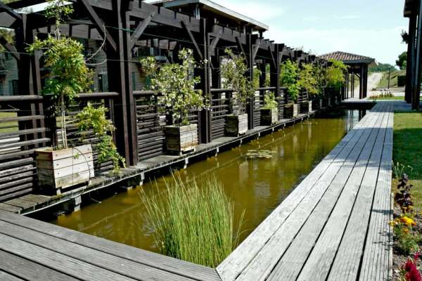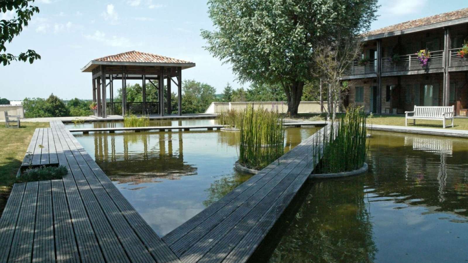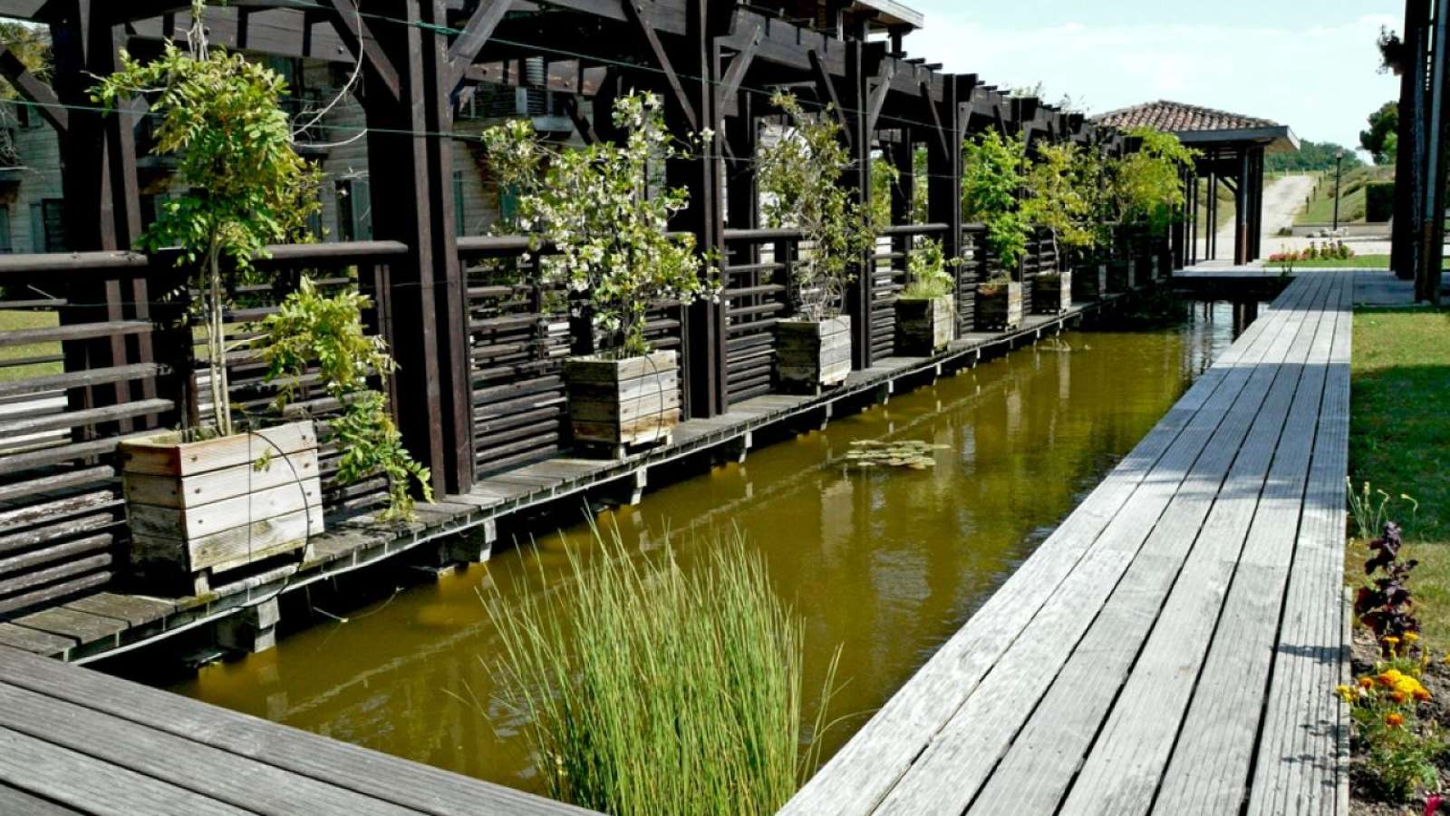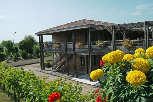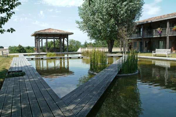 À 400 mètres à pied des Thermes de Jonzac, par de petits sentiers paysagés, la Maison des Vignes, médaillée en 2007 pour son architecture remarquable, offre le confort douillet de 40 beaux appartements d’environ 35 m² avec séjour-cuisine, chambre séparée et baies vitrées sur les jardins.