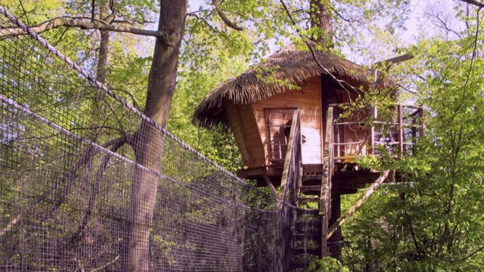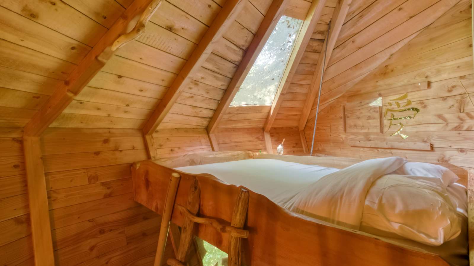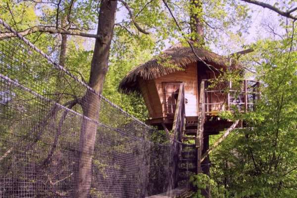La cabane Zen est une cabane dans les arbres suspendue à 8 mètres de hauteur dans un magnifique chêne centenaire. On y accède par un escalier en colimaçon, puis par un petit pont de singe d’environ 8 mètres qui vous mènera tout droit jusqu’à votre nid douillet.