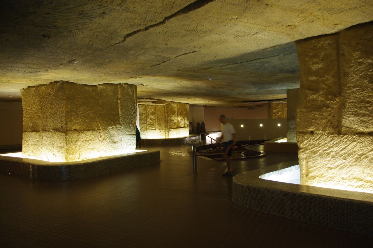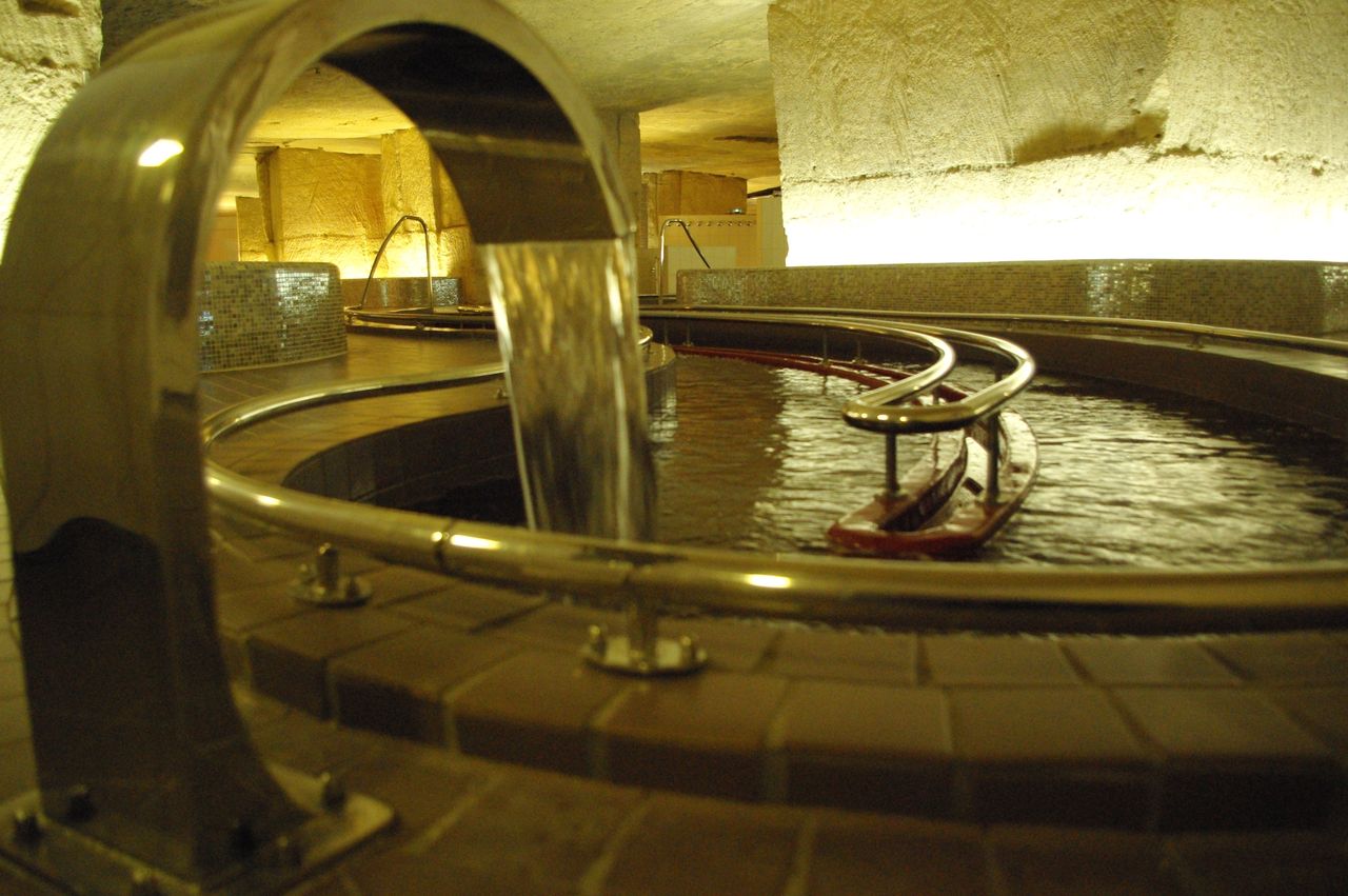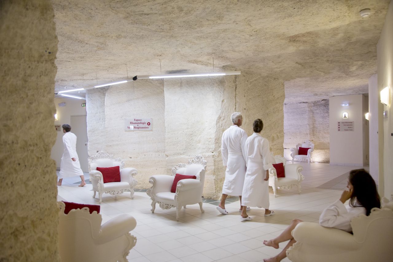Les thermes ont été aménagés dans les anciennes carrières de calcaire d’Heurtebise. Ainsi sont nés des thermes troglodytiques à l’atmosphère feutrée et loin du tumulte du quotidien. Les éclairages mettent en valeur les immenses colonnes de calcaire, le système de traitement garantit une excellente qualité de l’air. Les soins thermaux sont dispensés dans des locaux et cabines modernes avec tout le savoir-faire de la Chaîne Thermale du Soleil.