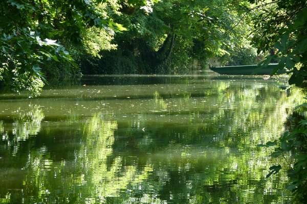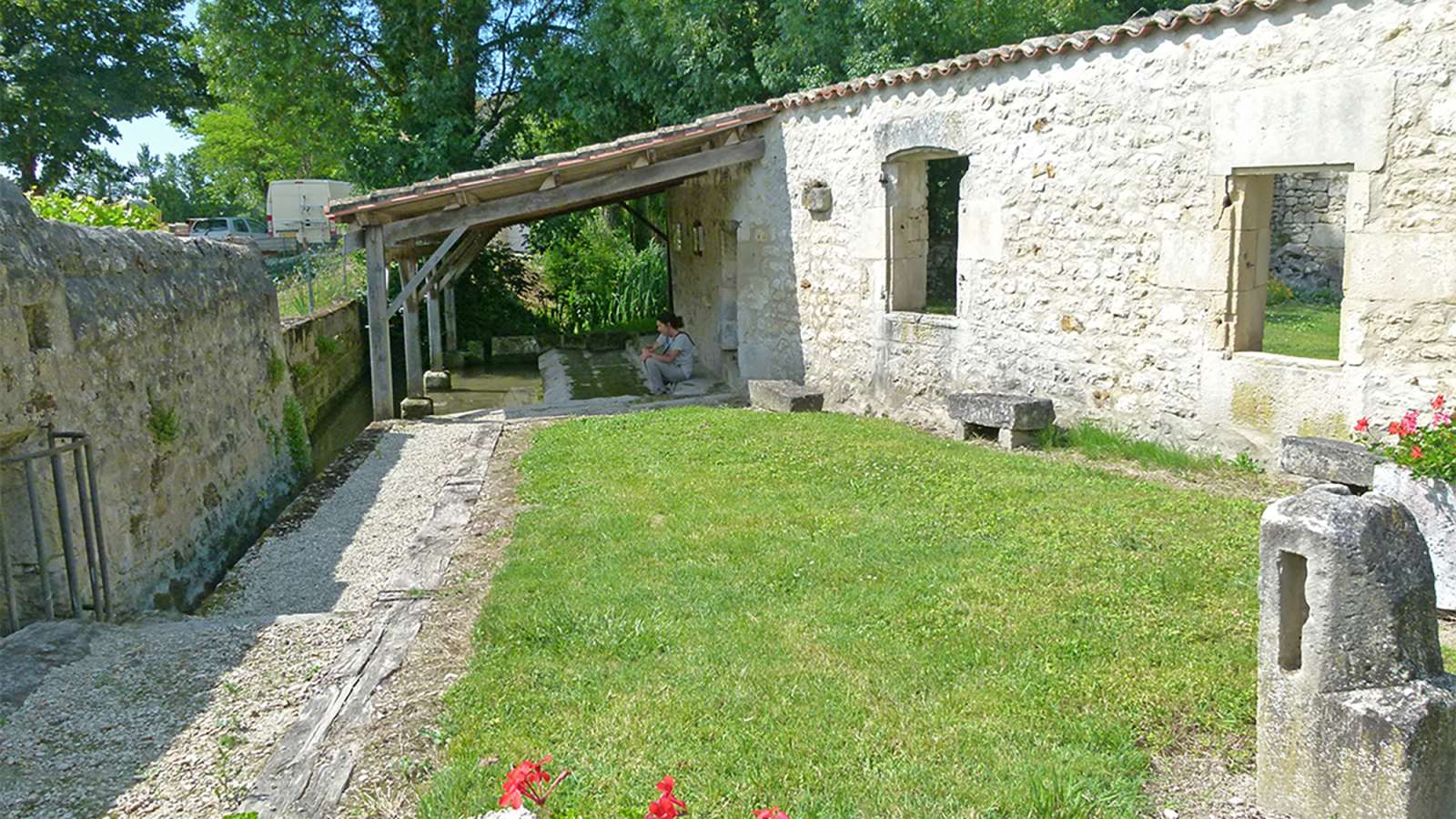 11) Une fois passée la champignonnière, aux premières maisons, tourner à la première à gauche (route de Potiron), traverser la voie ferrée, tourner à droite, longer la Seugne. À l’intersection, prendre à gauche rue de la glacière et passer la Seugne. Vous traverserez plusieurs petits ponts de la Seugne pour rejoindre le rond-point de St-Jacques-de-Compostelle 900m plus loin sur votre droite.