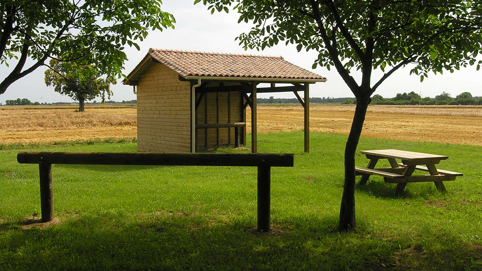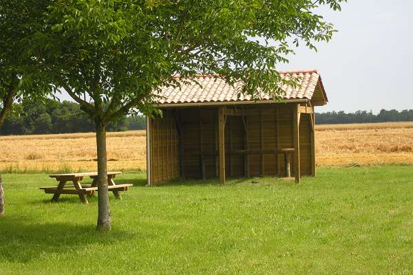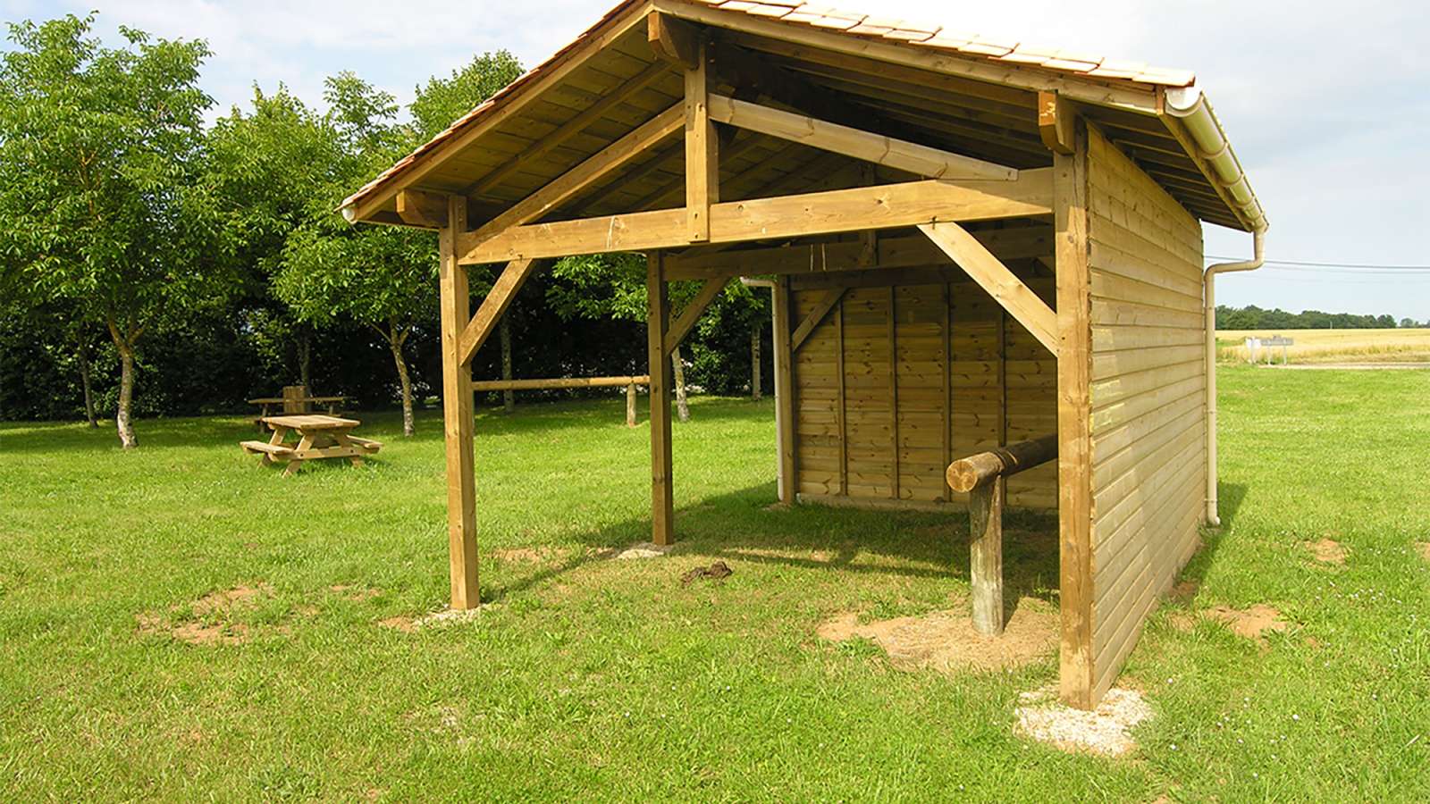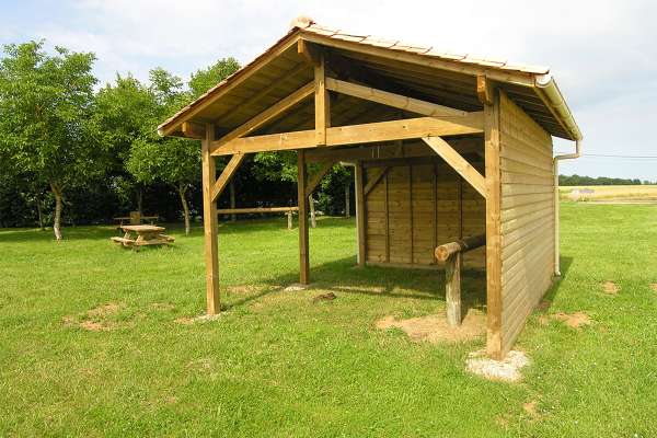 Les installations comprennent une cabane de 20m², des barres d'attache pour les chevaux, une table de pique-nique, une poubelle...