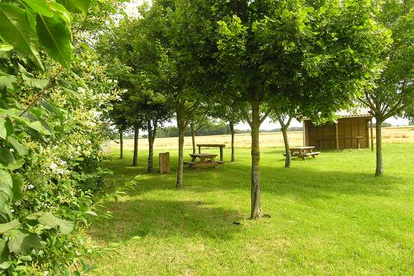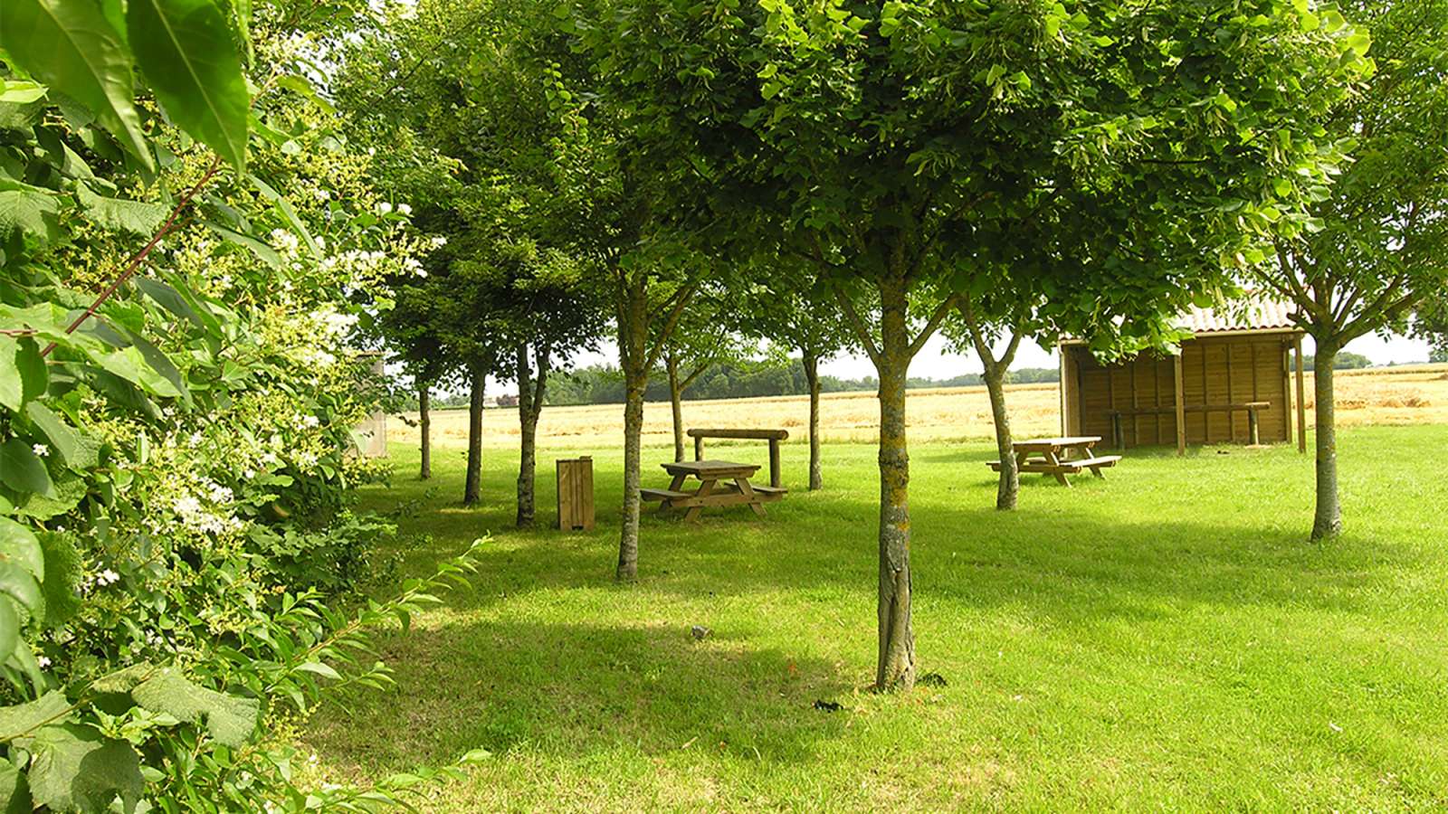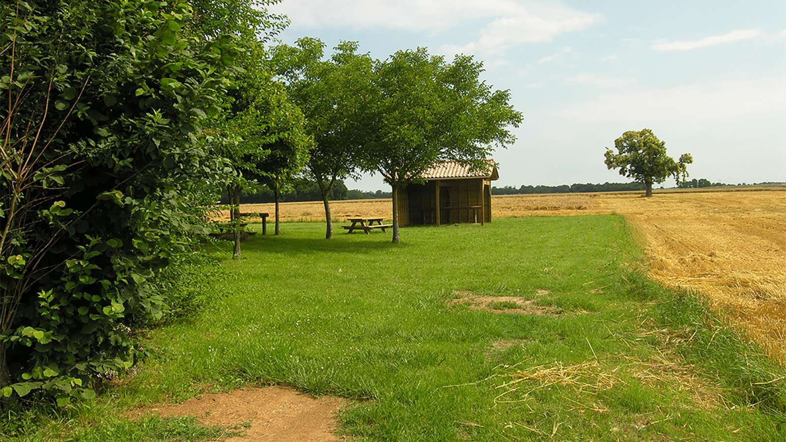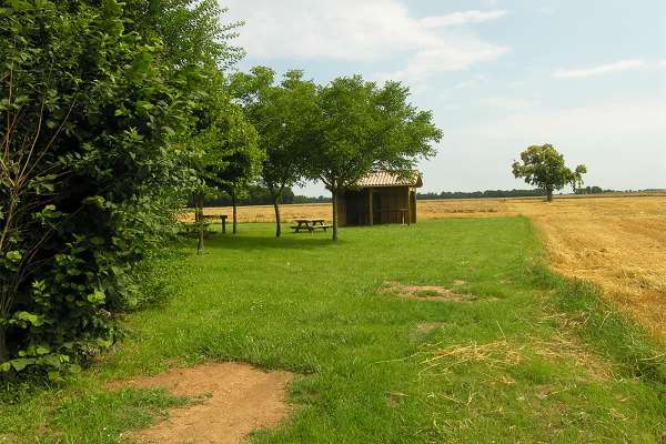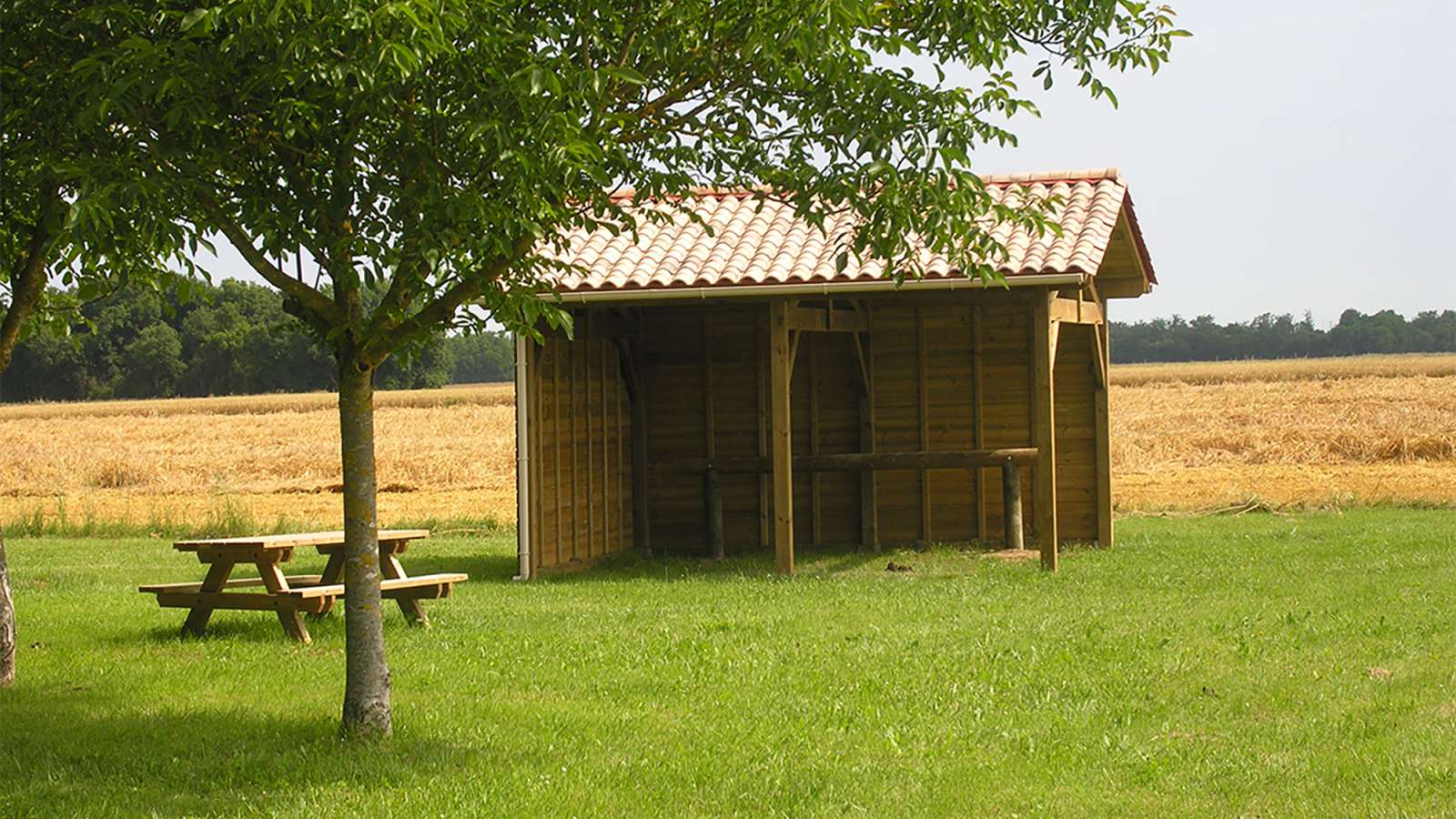 Les installations comprennent une cabane de 20m², des barres d'attache pour les chevaux, une table de pique-nique, une poubelle...
