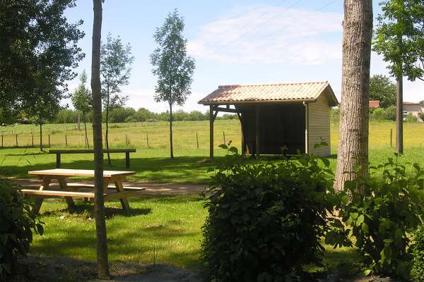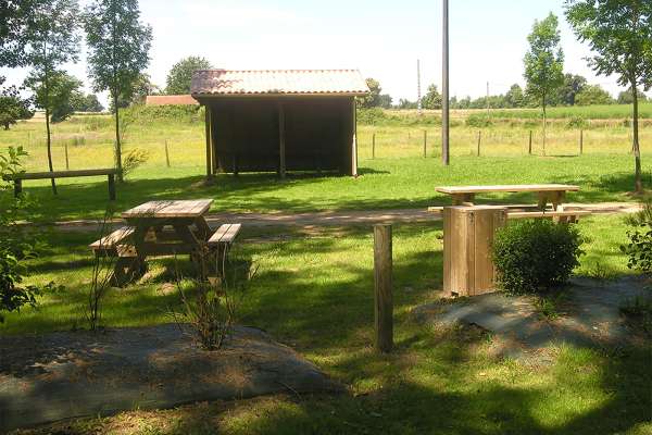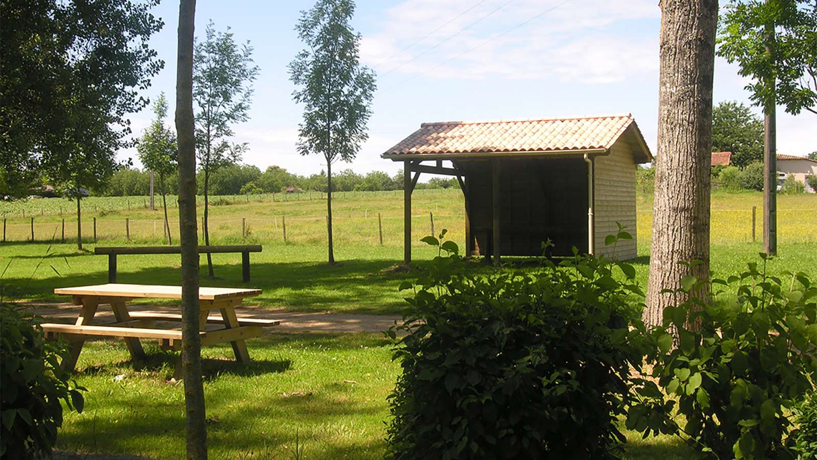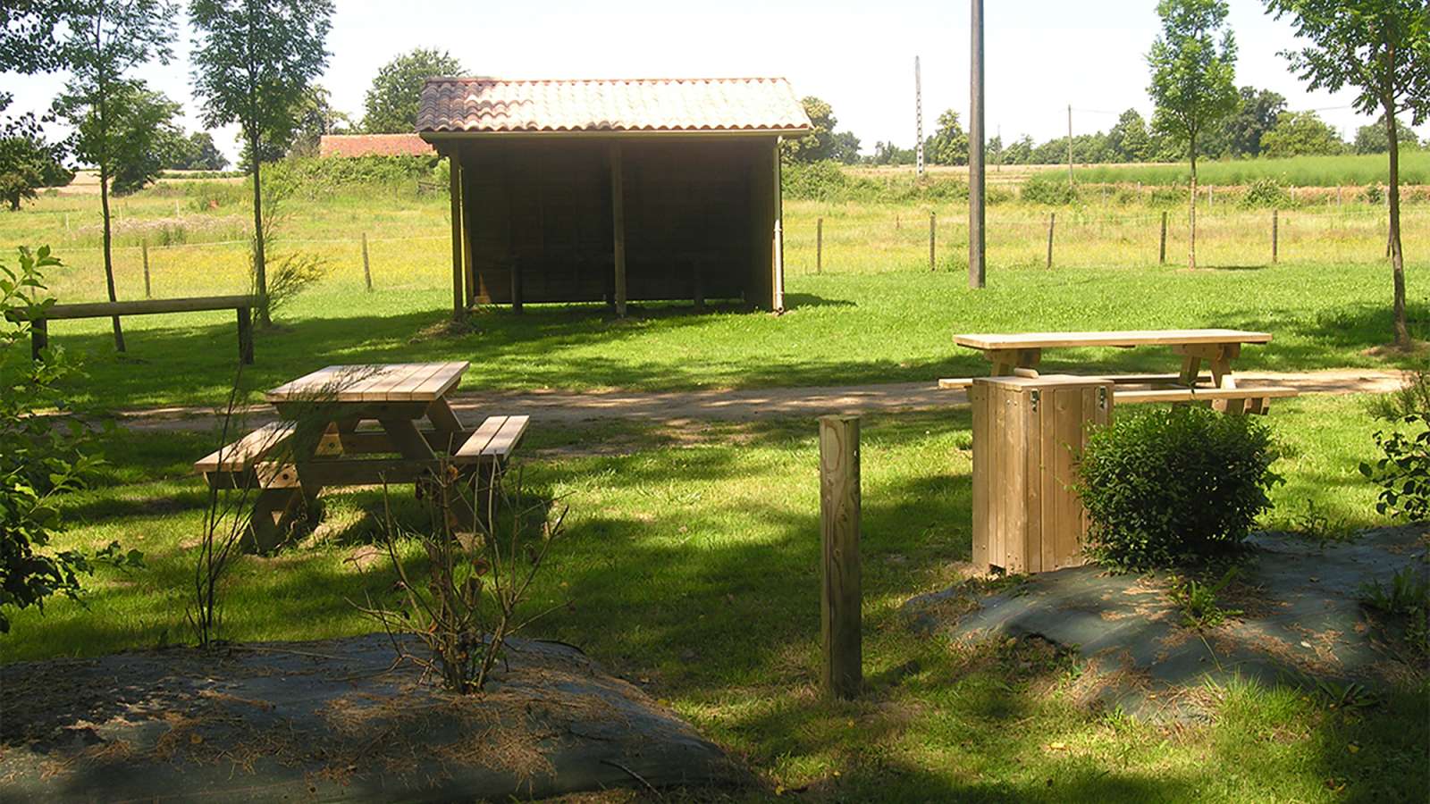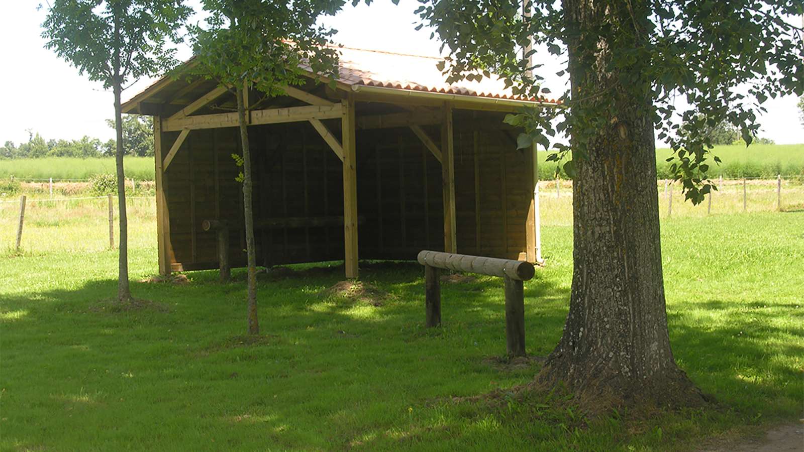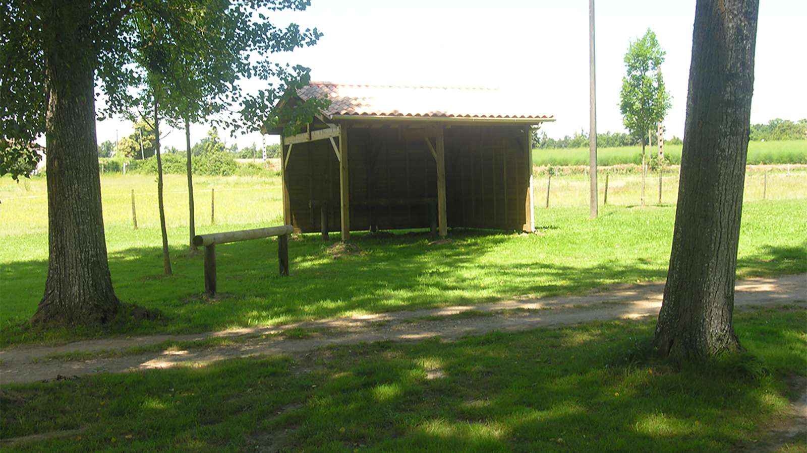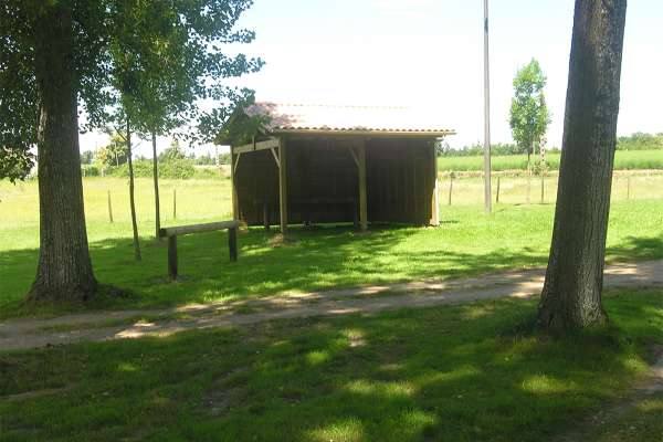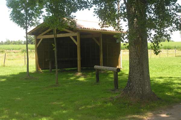 Les installations comprennent une cabane de 20m², des barres d'attache pour les chevaux, une table de pique-nique, une poubelle...
