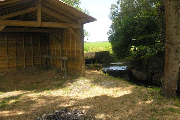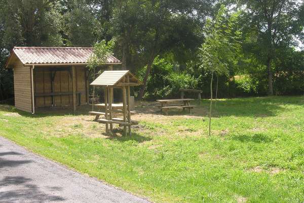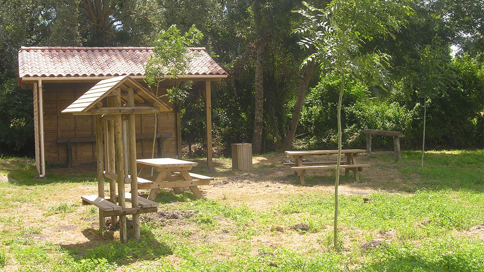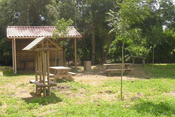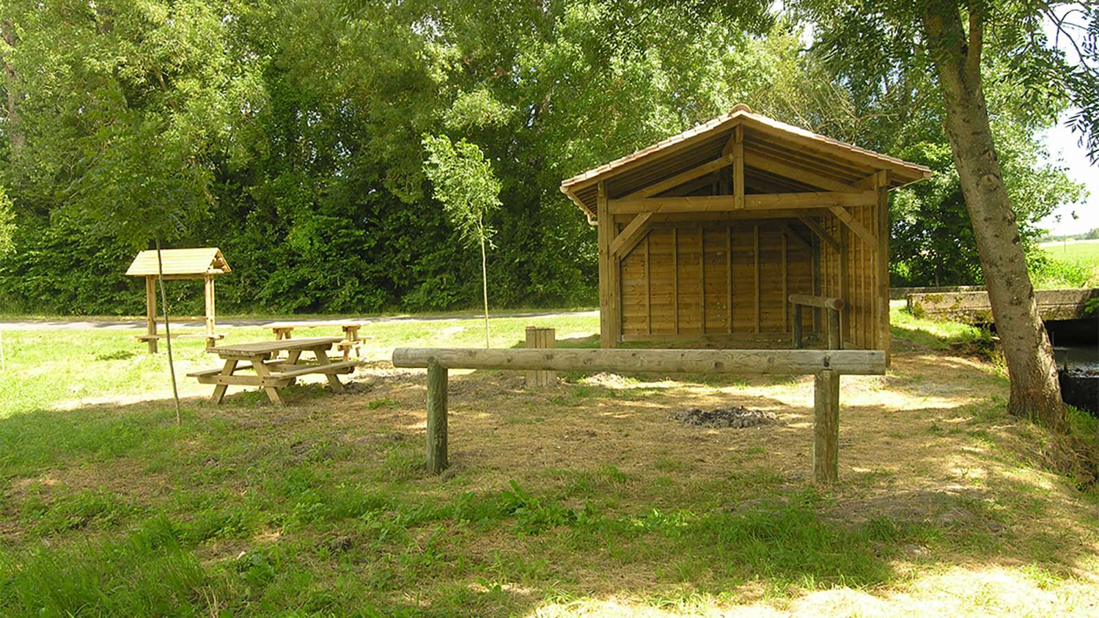 Les installations comprennent une cabane de 20m², des barres d'attache pour les chevaux, une table de pique-nique, une poubelle...