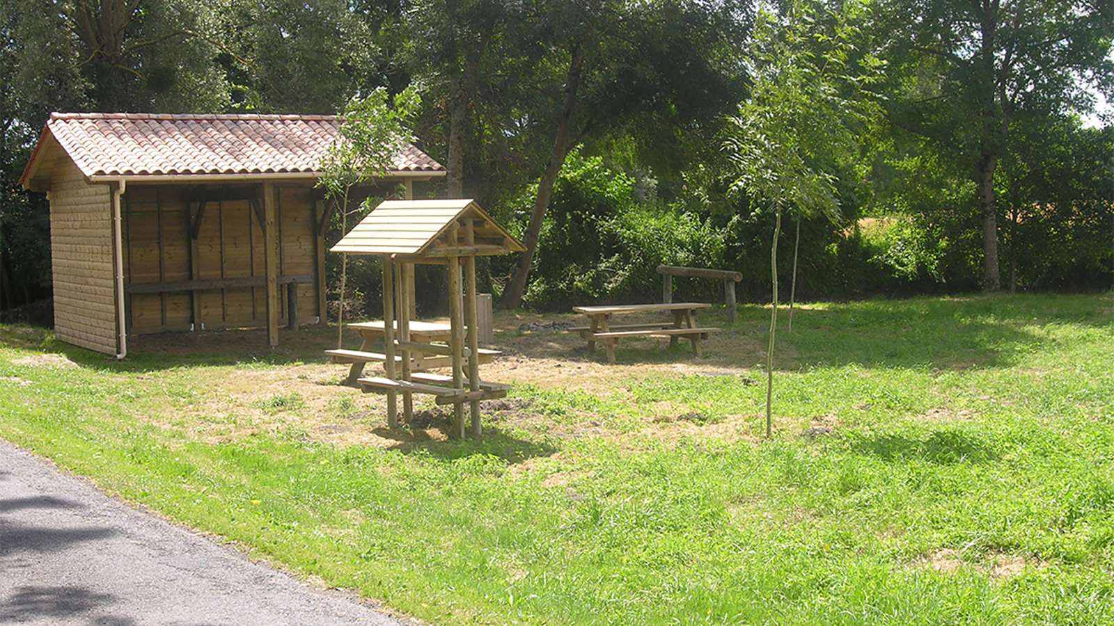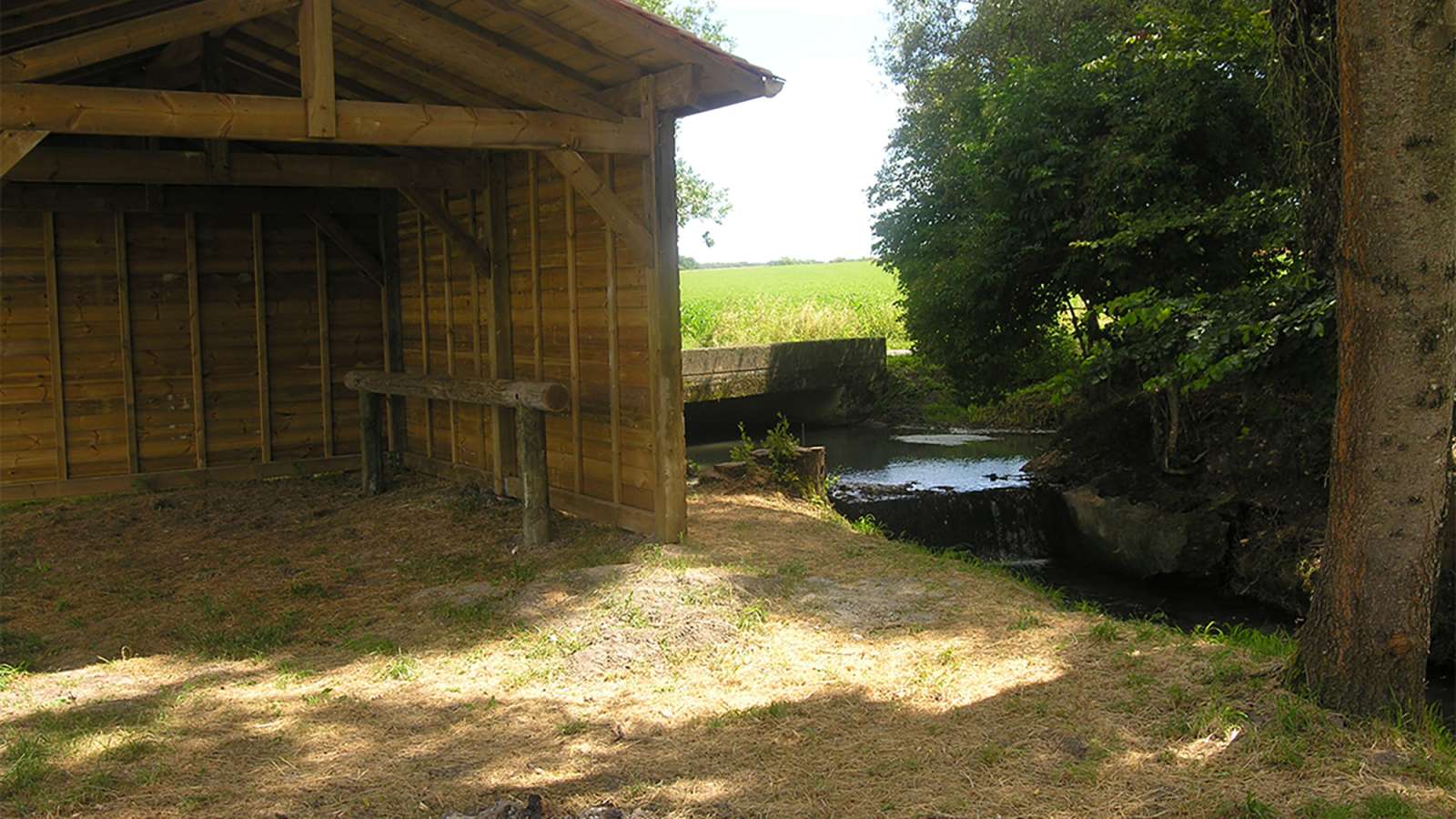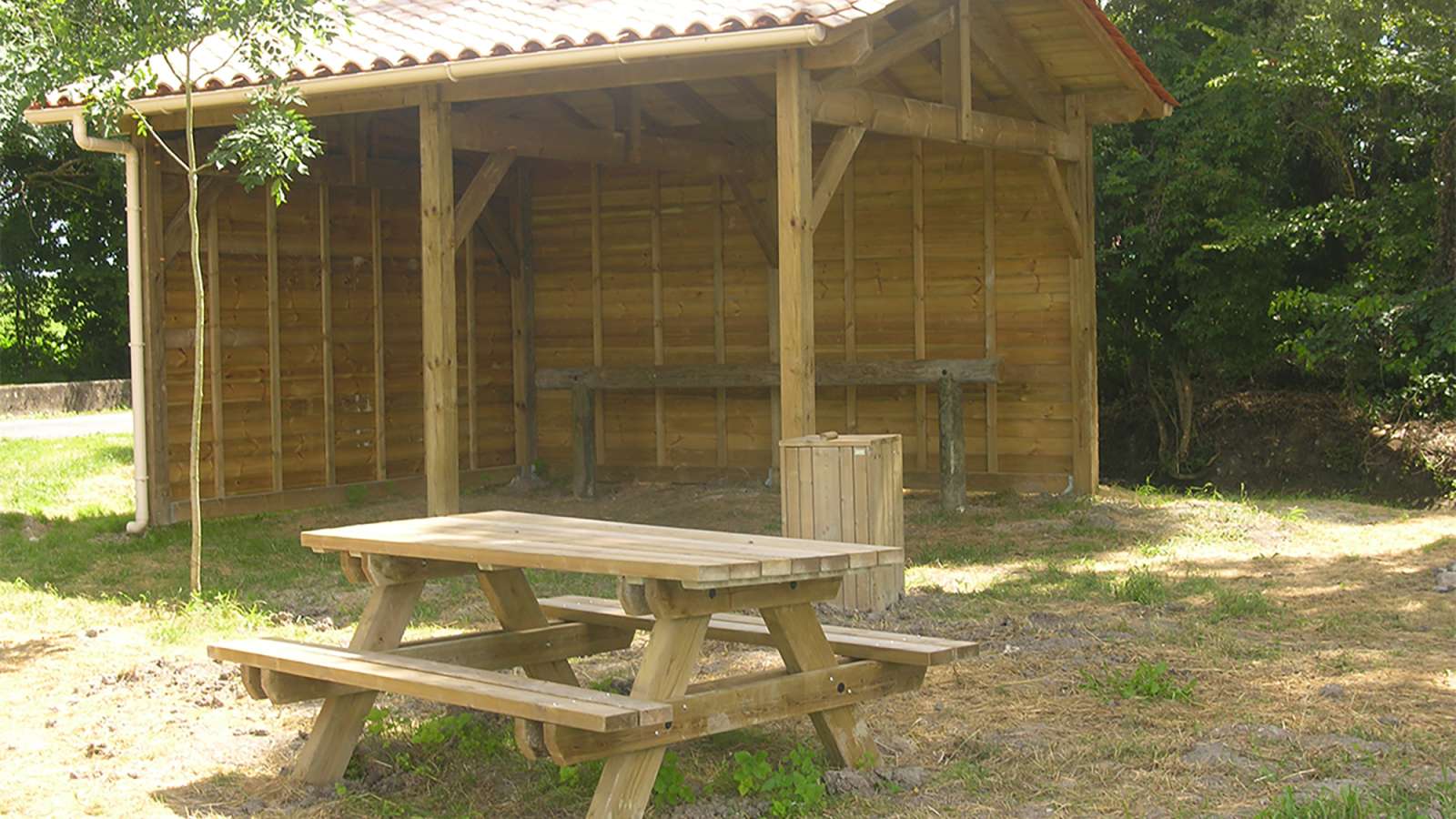 Les installations comprennent une cabane de 20m², des barres d'attache pour les chevaux, une table de pique-nique, une poubelle...