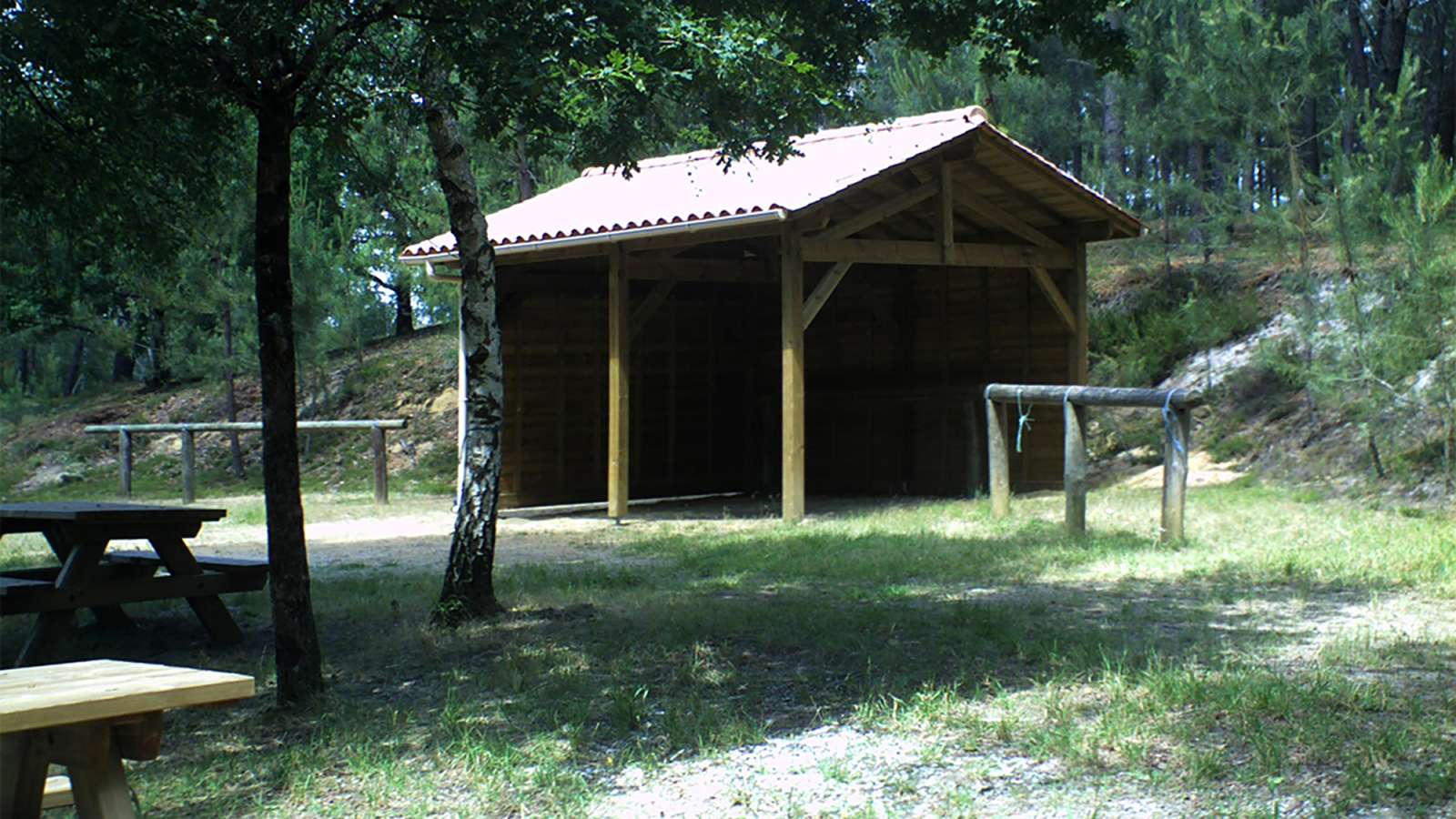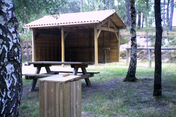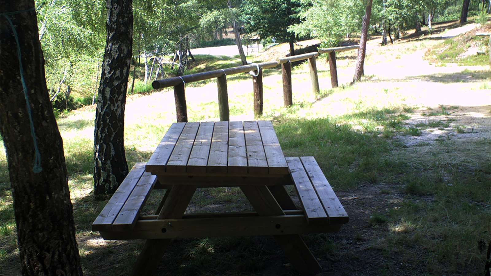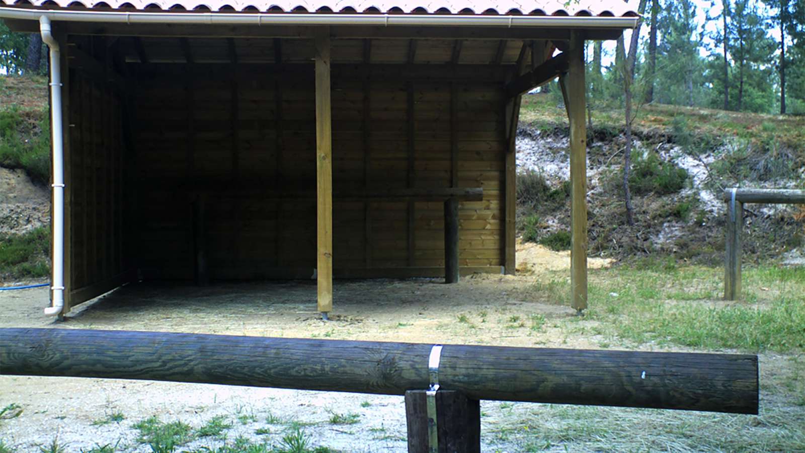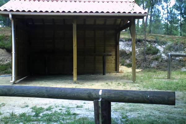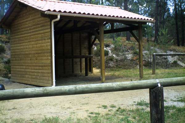 Les installations comprennent une cabane de 20m², des barres d'attache pour les chevaux, une table de pique-nique, une poubelle...