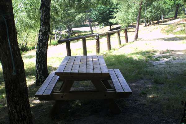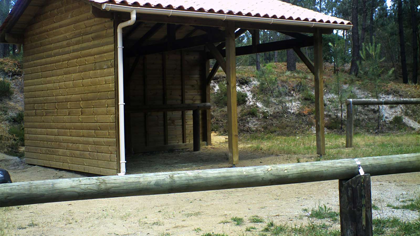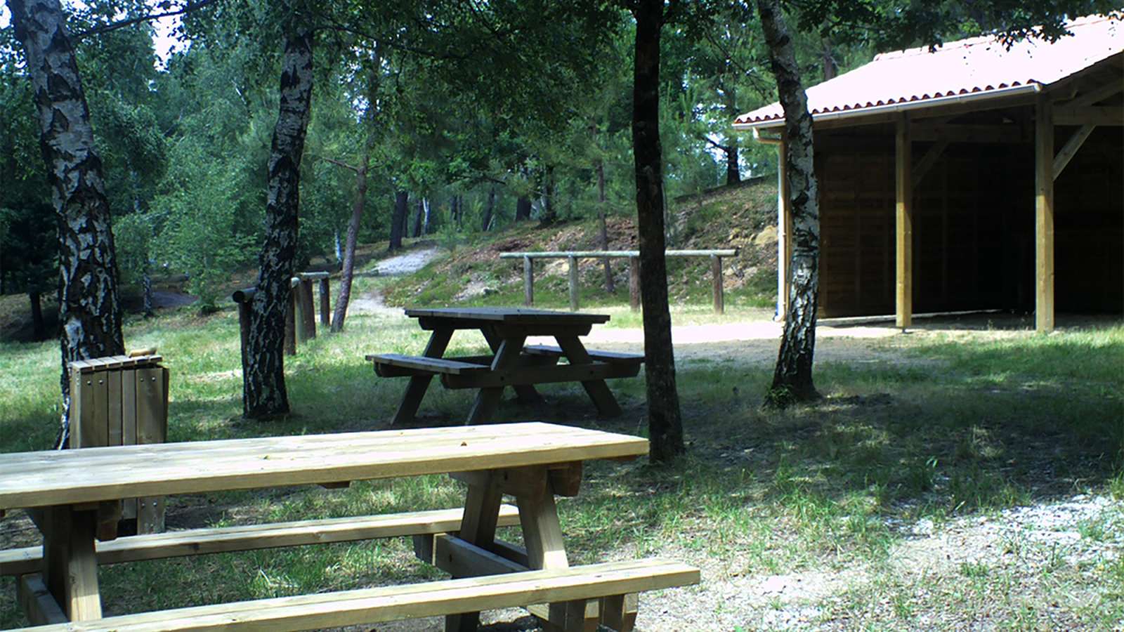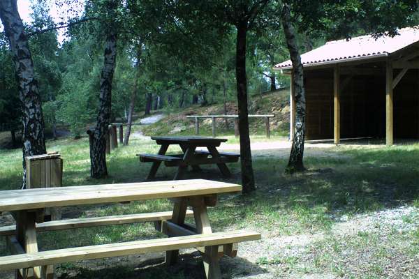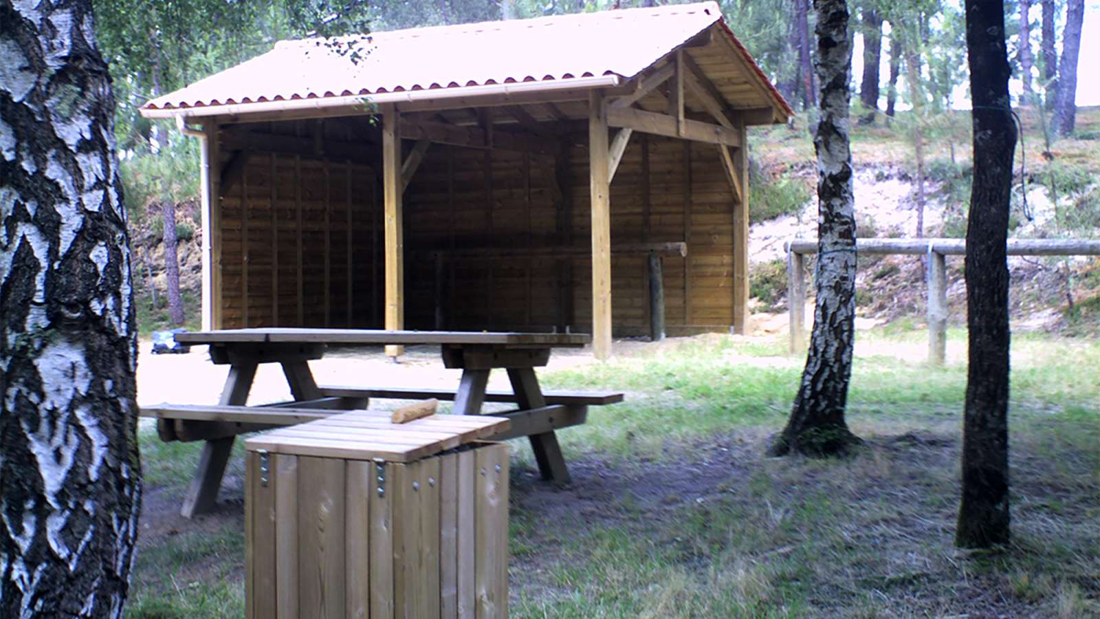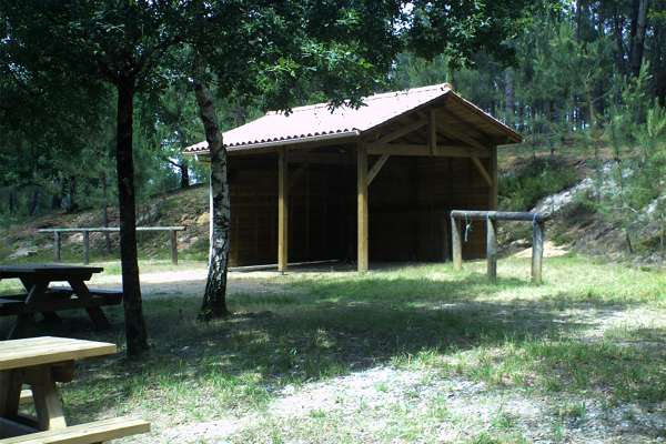 Les installations comprennent une cabane de 20m², des barres d'attache pour les chevaux, une table de pique-nique, une poubelle...