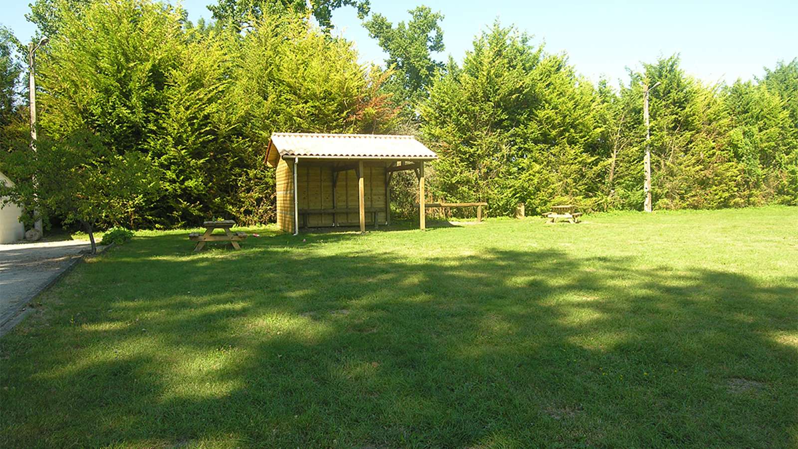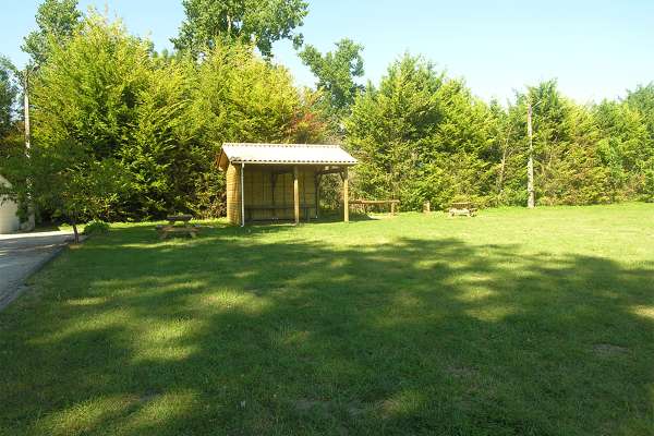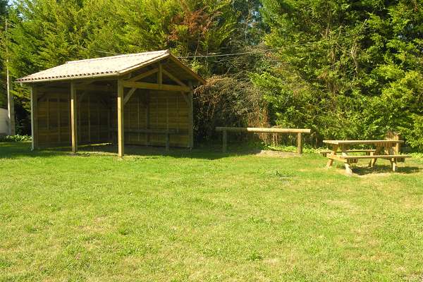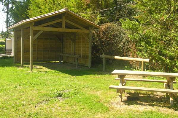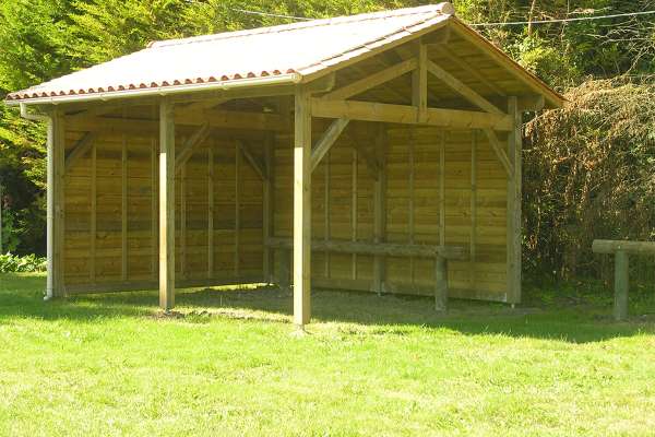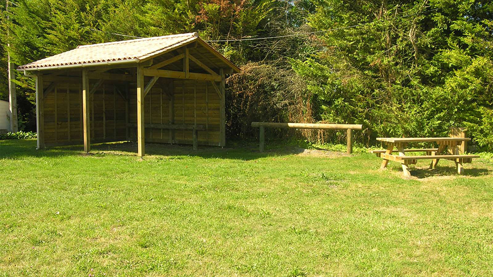 Les installations comprennent une cabane de 20m², des barres d'attache pour les chevaux, une table de pique-nique, une poubelle...