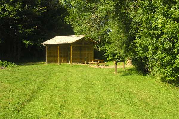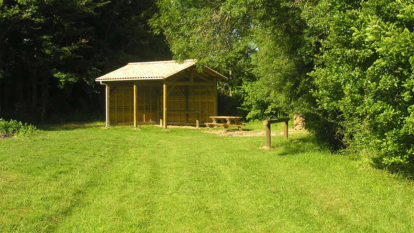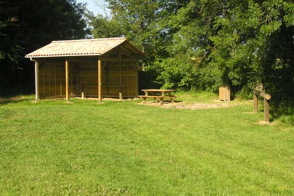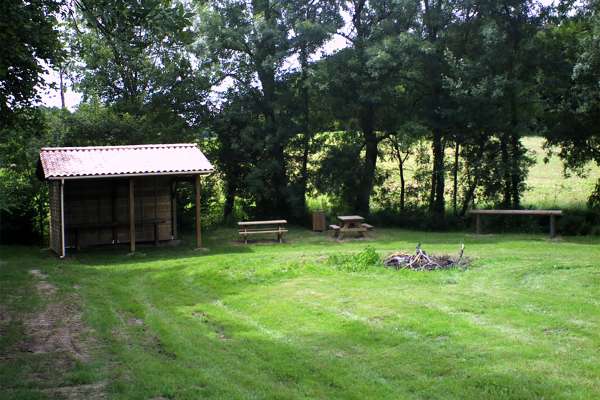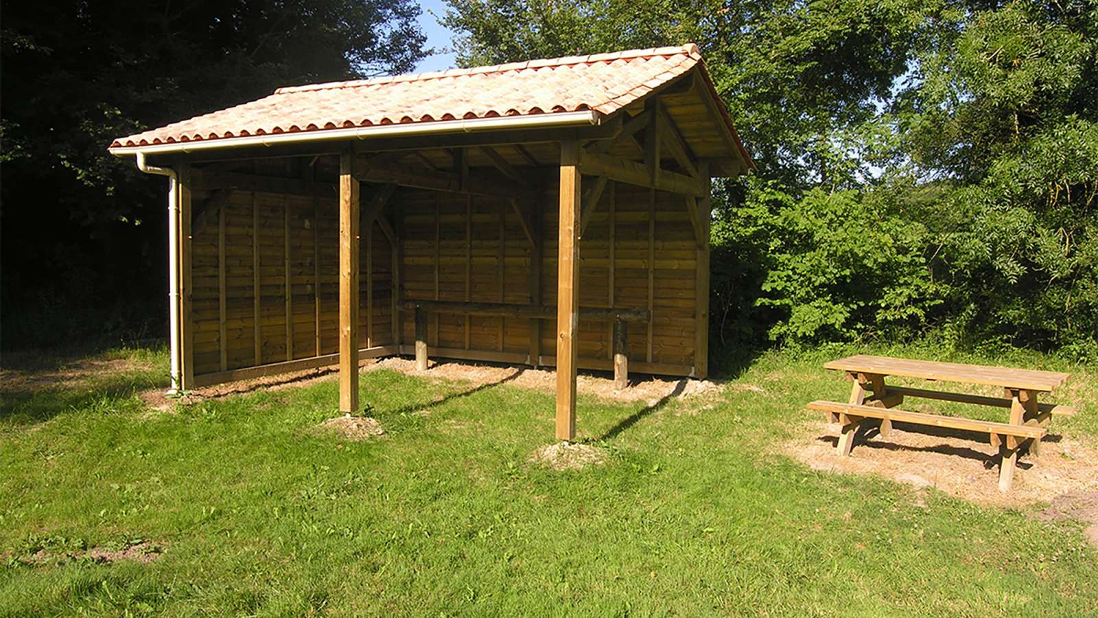 Les installations comprennent une cabane de 20m², des barres d'attache pour les chevaux, une table de pique-nique, une poubelle...