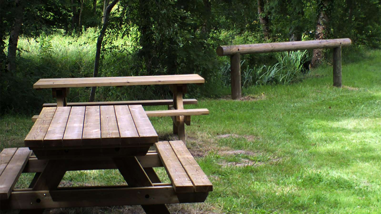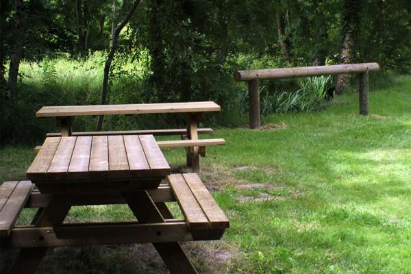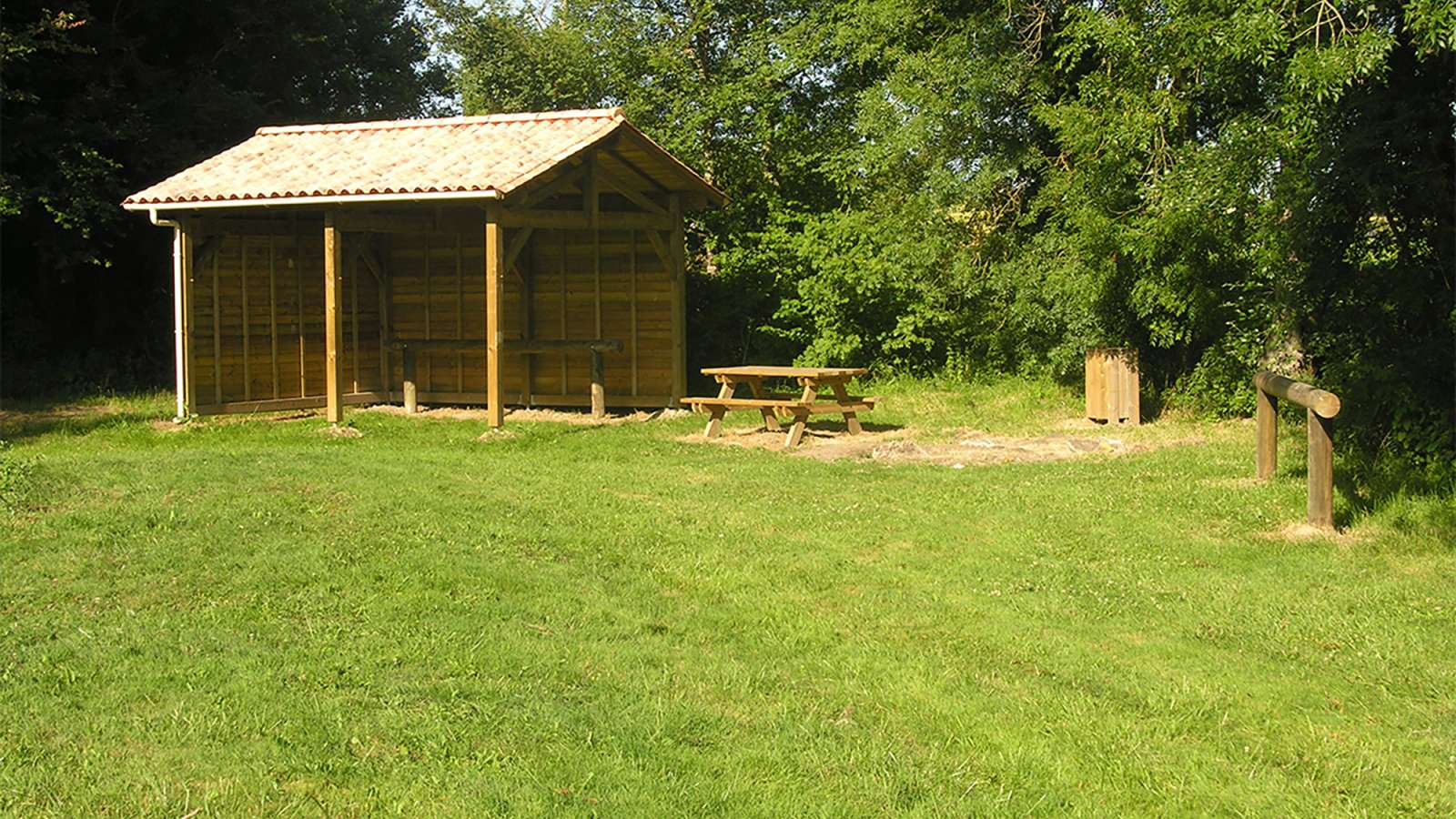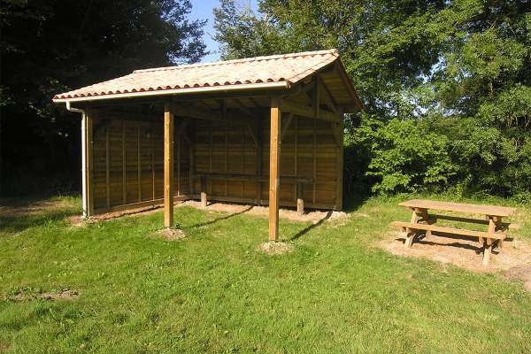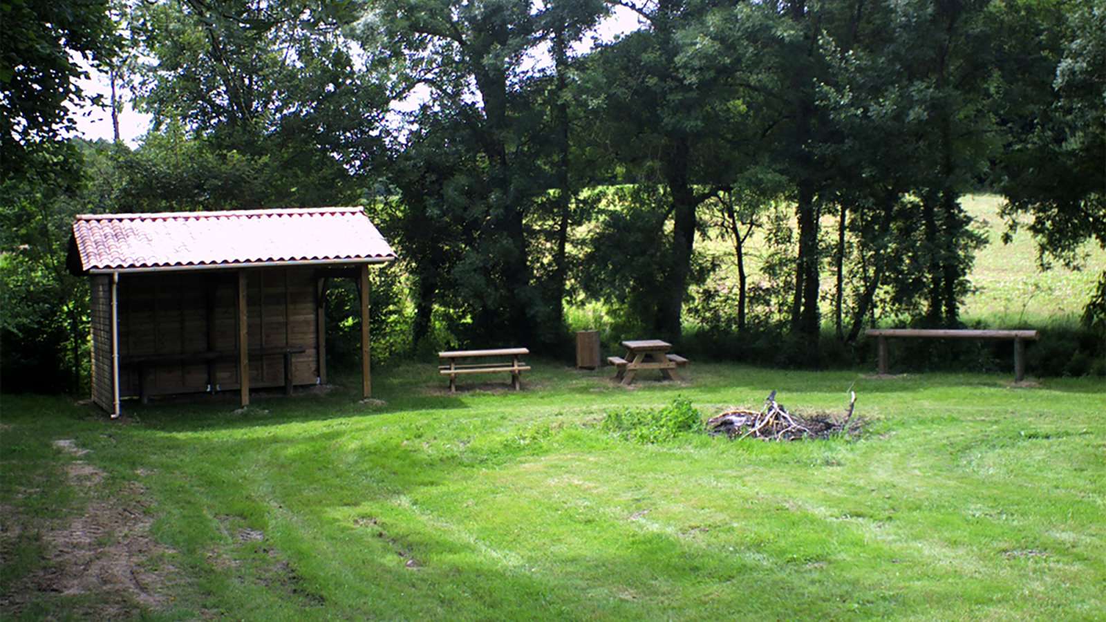 Les installations comprennent une cabane de 20m², des barres d'attache pour les chevaux, une table de pique-nique, une poubelle...
