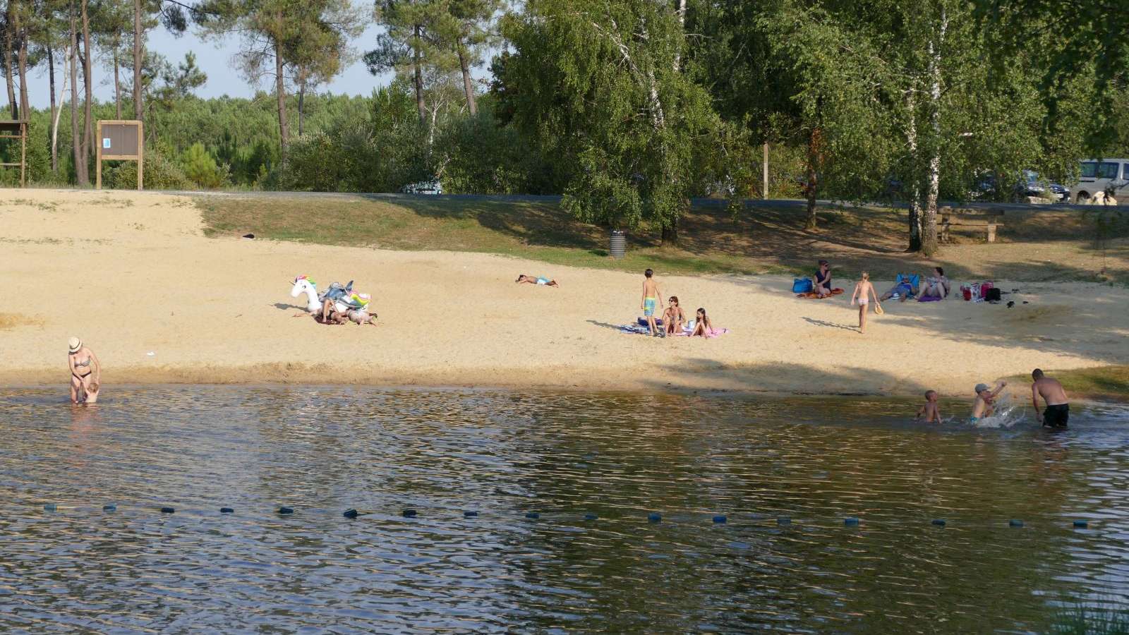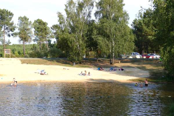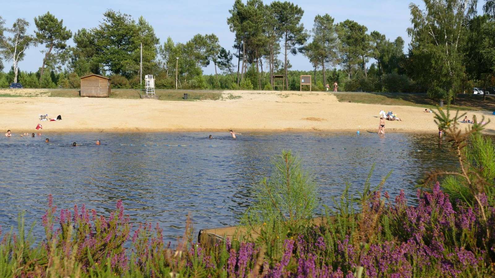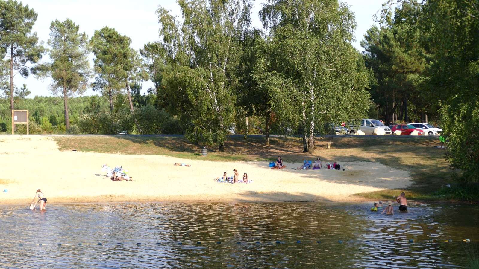 Plan d'eau artificiel avec plage de sable entouré de verdure, Baignade gratuite toute l'année, surveillée en juillet et août.