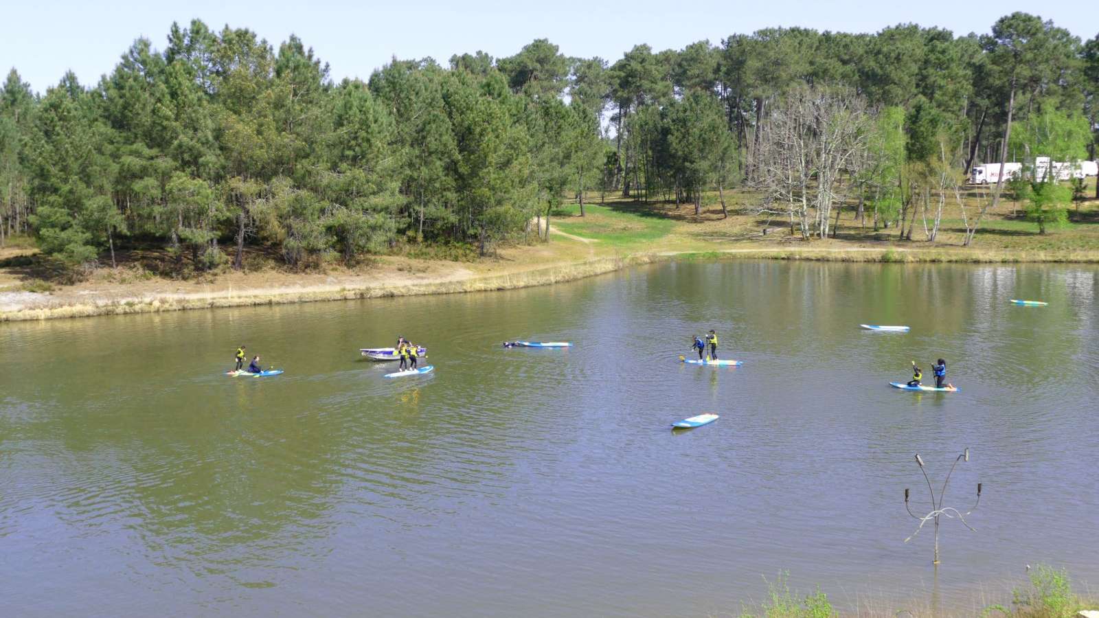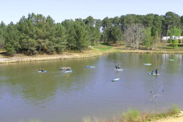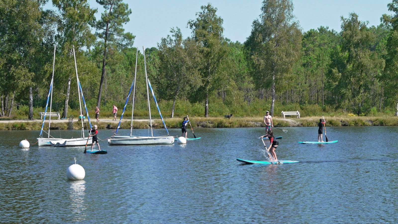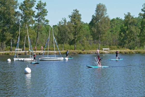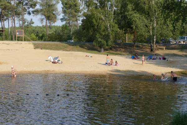 Plan d'eau artificiel avec plage de sable entouré de verdure, Baignade gratuite toute l'année, surveillée en juillet et août.