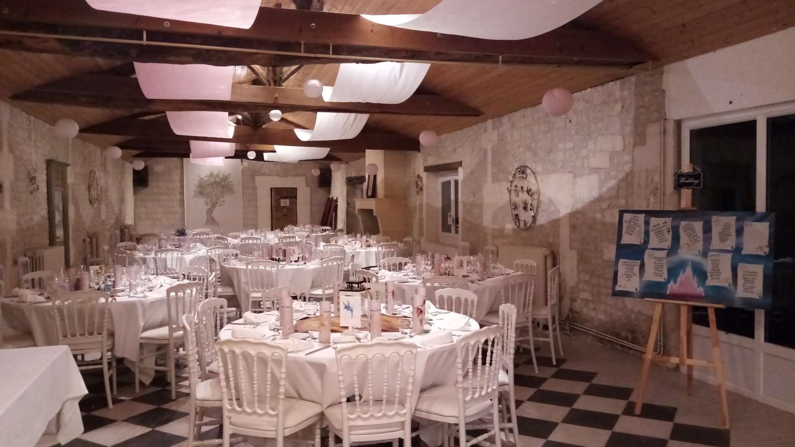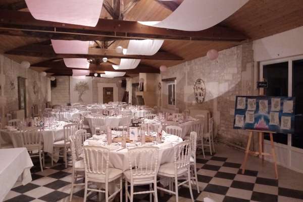 Au cœur d'un domaine remarquable des Charentes dans le triangle Jonzac-Cognac-Barbezieux, découvrez ce lieu unique, idéal pour un mariage, des réunions de familles ou des soirées entre amis. Notre salle de réception est l'ancien chai du Domaine, ancienne propriété viticole de Petite Champagne. Elle possède de beaux murs de pierre et une cheminée. La salle fait 140 m2 et est équipée d'un office de cuisine totalement rénové par nos soins avec du matériel inox professionnel dont une chambre froide double, plonge professionnelle, tables inox pour dresser. La salle peut accueillir jusqu'à 80 personnes avec la piste de danse et nous fournissons les tables (14 rondes et 1 table rectangulaire ) et les chaises en bois et paille. Devant la maison, une grande pelouse peut accueillir une réception ou vin d'honneur jusqu'à 200 personnes. La maison est enserrée dans un parc de 8000m2, traversé par une rivière. Il y a des sous-bois avec des peupliers centenaires où il est possible d'organiser une cérémonie laïque par exemple ou de tenir le vin d'honneur. Le Domaine dispose d'une grande piscine (12x6), sécurisée par un abri posé en 2023, avec terrasse où le vin d'honneur peut également être servi. Location pour des réceptions de mariage, anniversaires, baptêmes mais également des réunions de travail, séminaires, team building, formations, expositions... Forfait demi-journée, jusqu'à 30 personnes : devis sur mesure Forfait journée, jusqu'à 30 personnes : devis sur mesure Forfait journée, jusqu'à 90 personnes : devis sur mesure Forfait privatisation week-end, jusqu'à 80 personnes (salle de réception avec l'office, les cinq chambres d'hôtes, la piscine et le parc : 3 200 euros