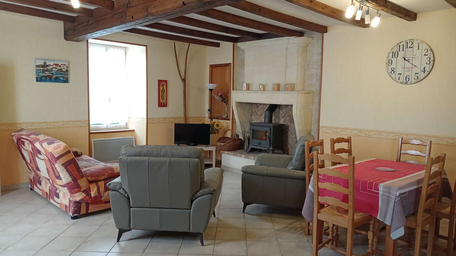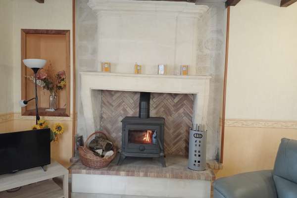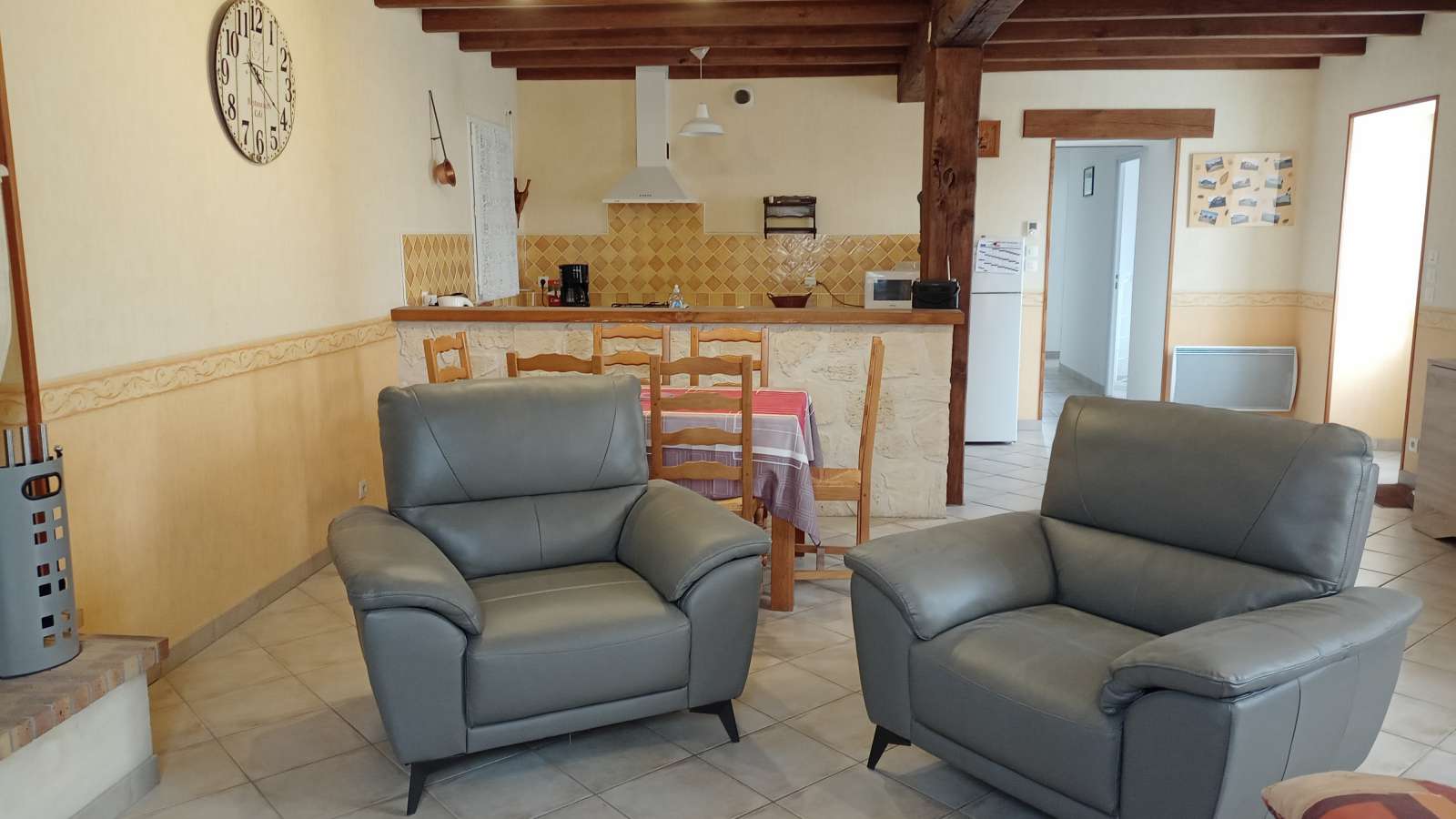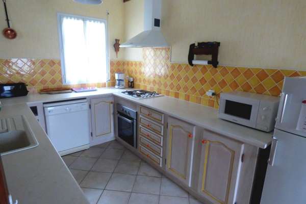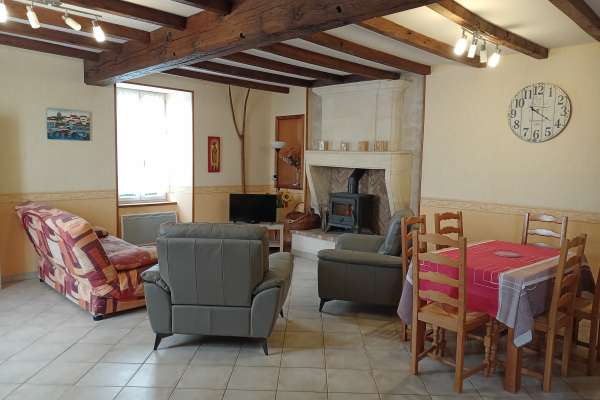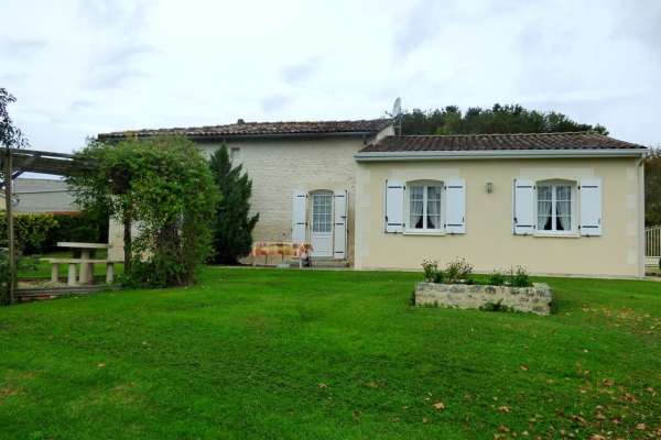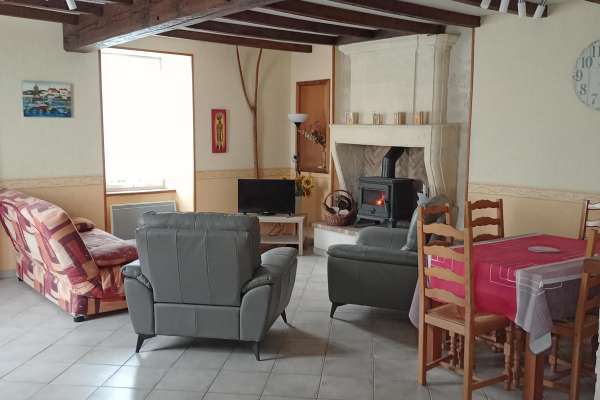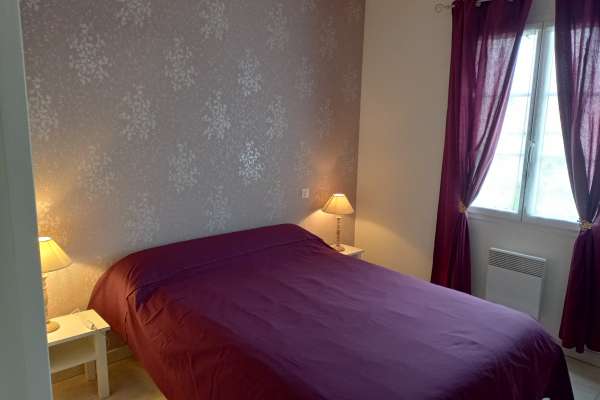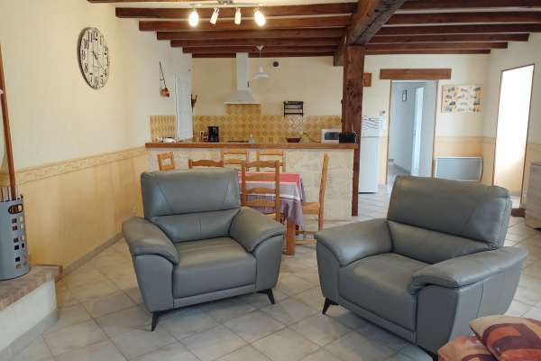 Maison au rez-de-chaussée à 5km de Jonzac Comprenant un coin cuisine équipé avec entre autres un lave-vaisselle, un four, un micro-ondes, un séjour avec télévision, deux chambres, l'une avec un lit de 140, l'autre avec deux lits de 90.