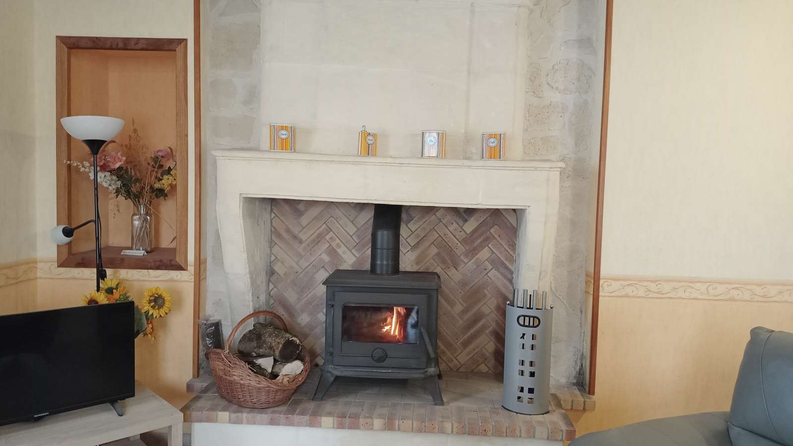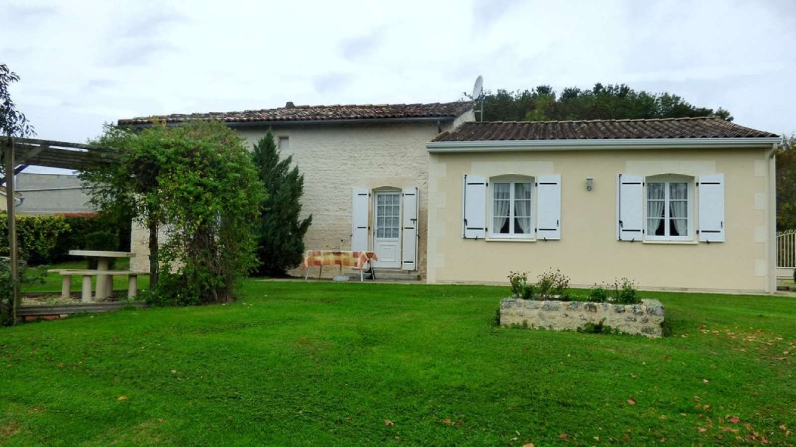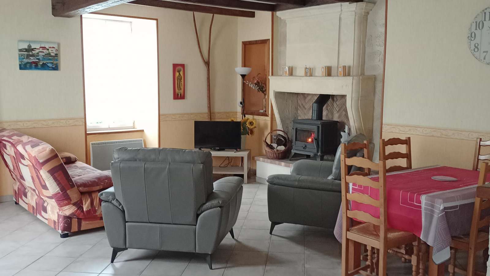 Maison au rez-de-chaussée à 5km de Jonzac Comprenant un coin cuisine équipé avec entre autres un lave-vaisselle, un four, un micro-ondes, un séjour avec télévision, deux chambres, l'une avec un lit de 140, l'autre avec deux lits de 90.